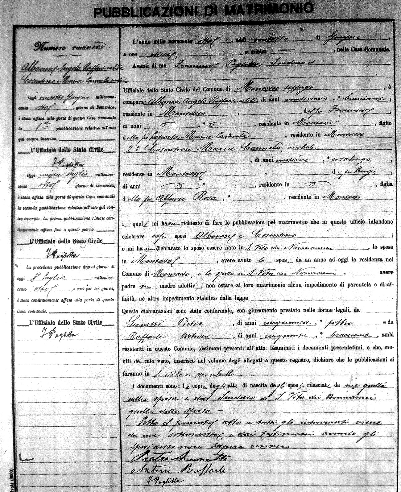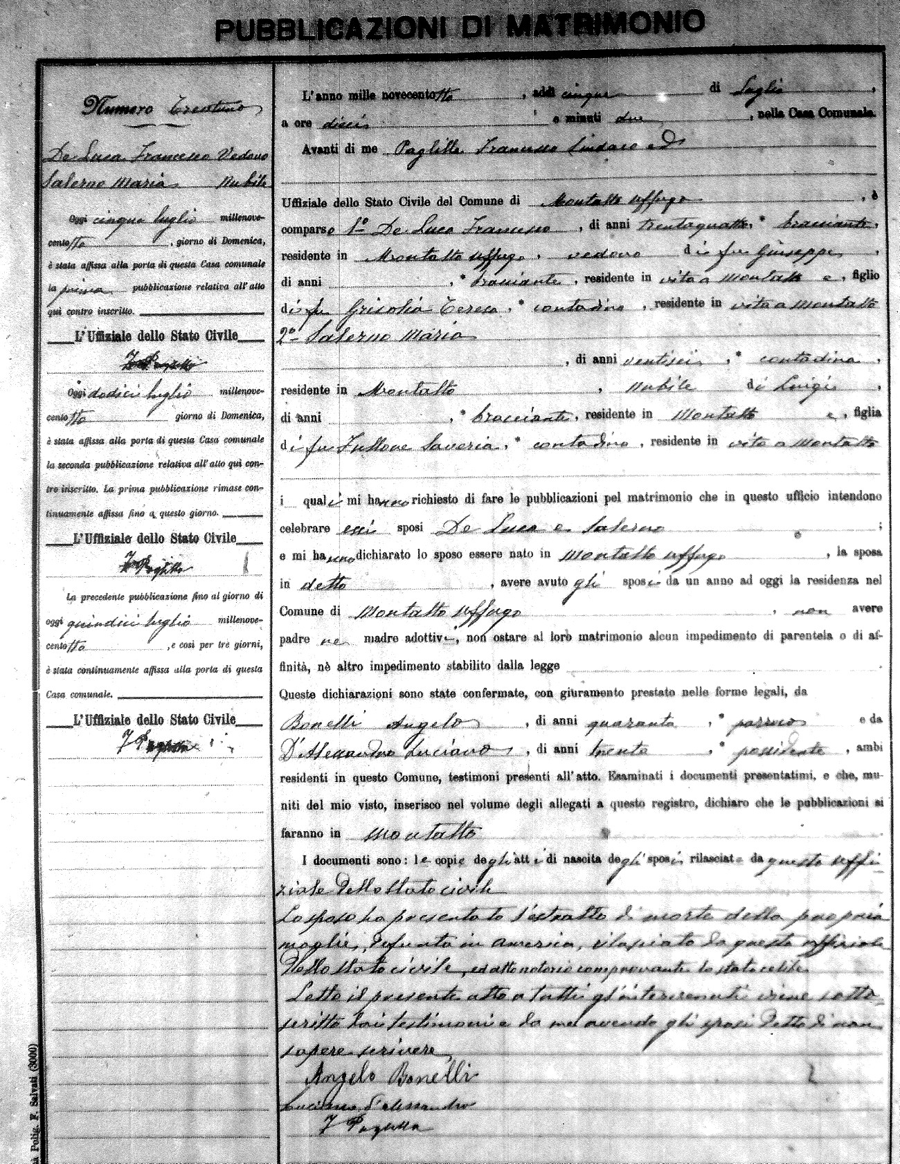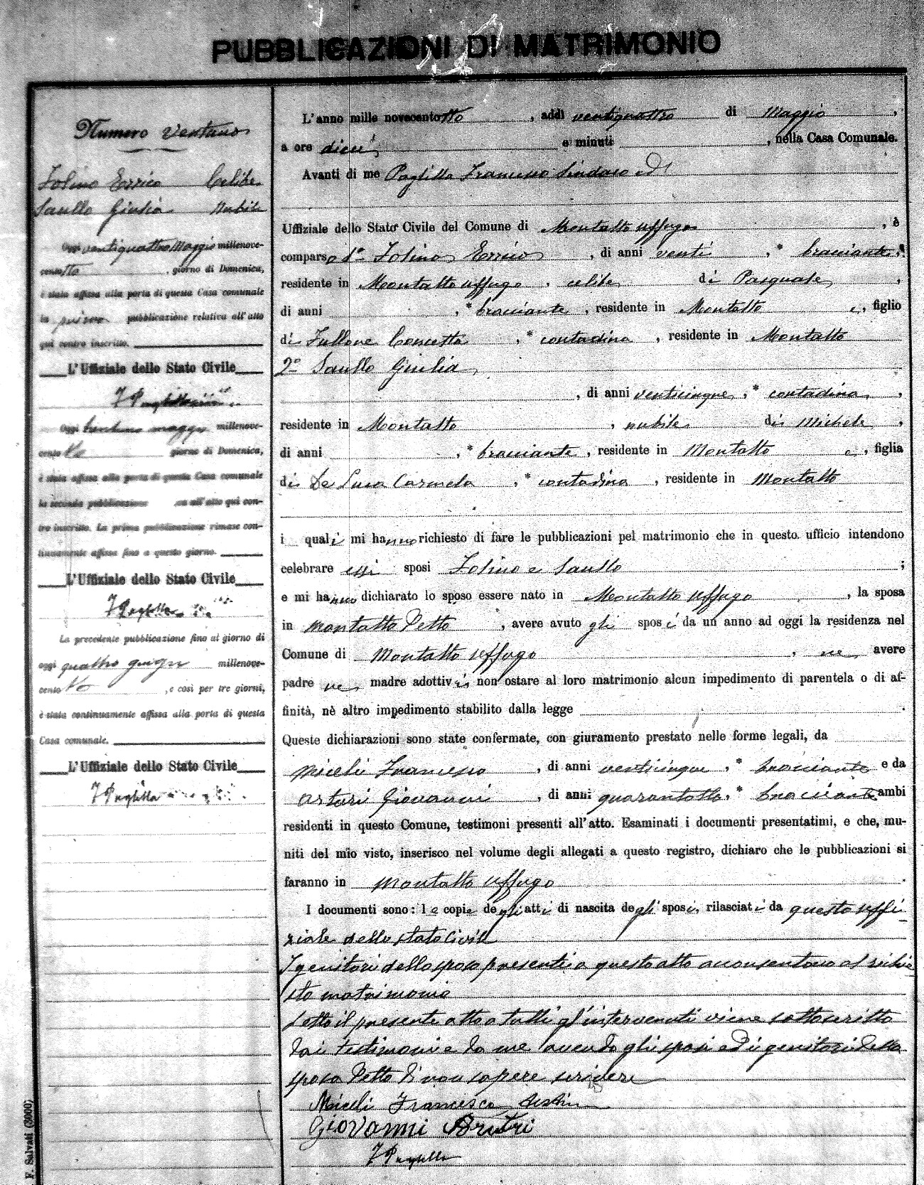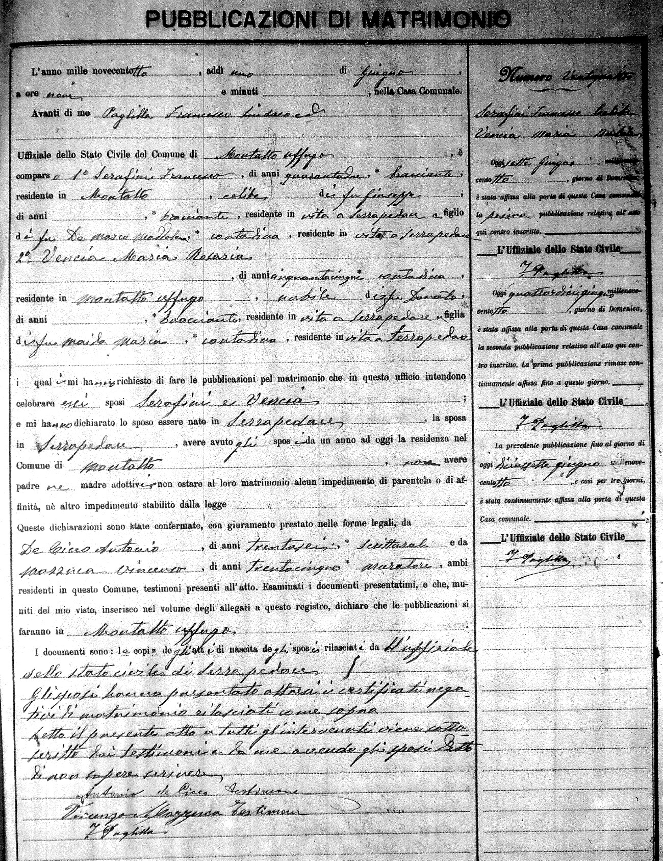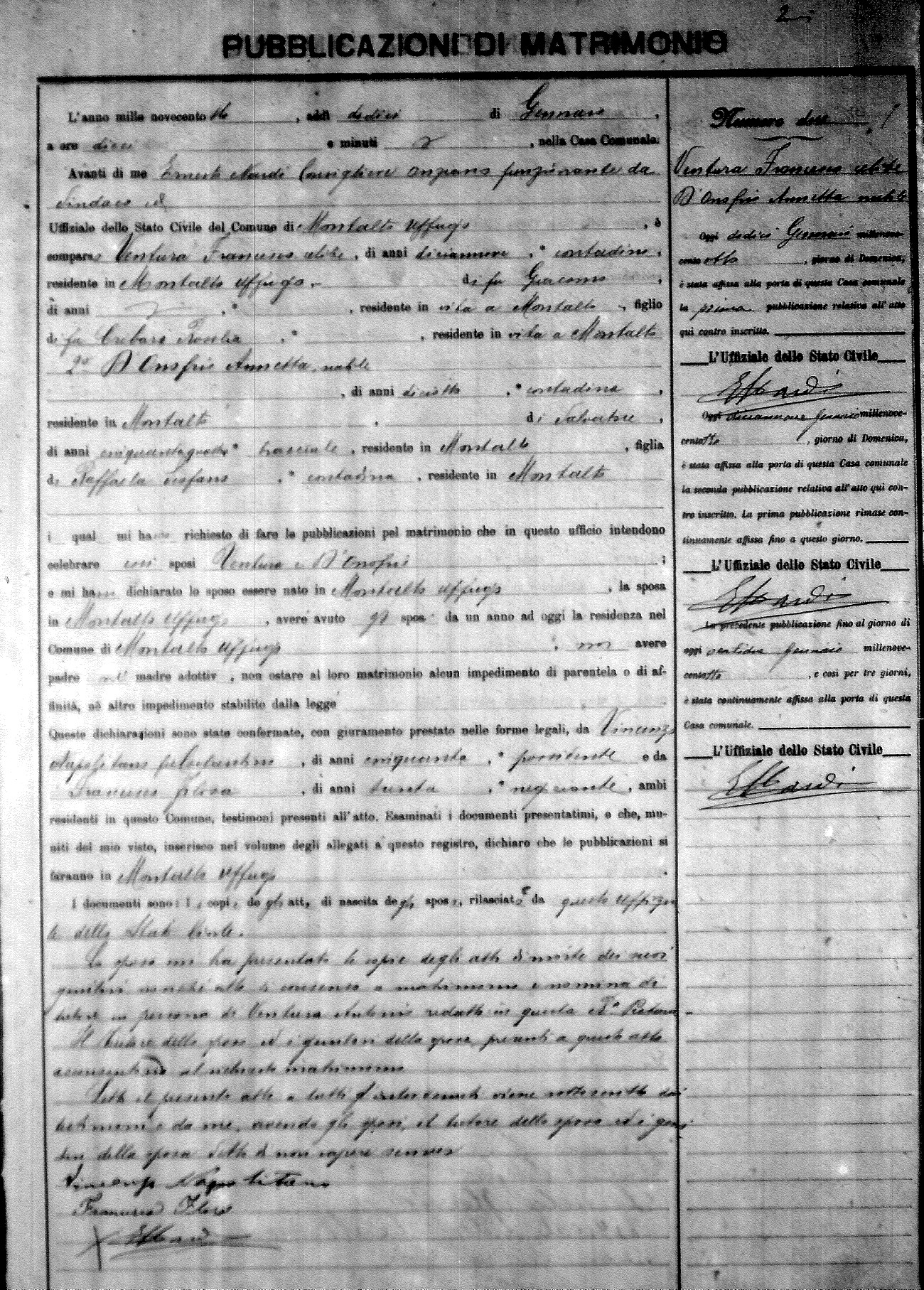 Here are the extractions for the marriage banns in 1908 for Montalto Uffugo. Each extraction has a link to a copy of the original document on the groom's surname. Please note: (fu) indicates the the person was deceased at the time of the marriage bann. For a translation of the basic Pubblicazioni document, look here.