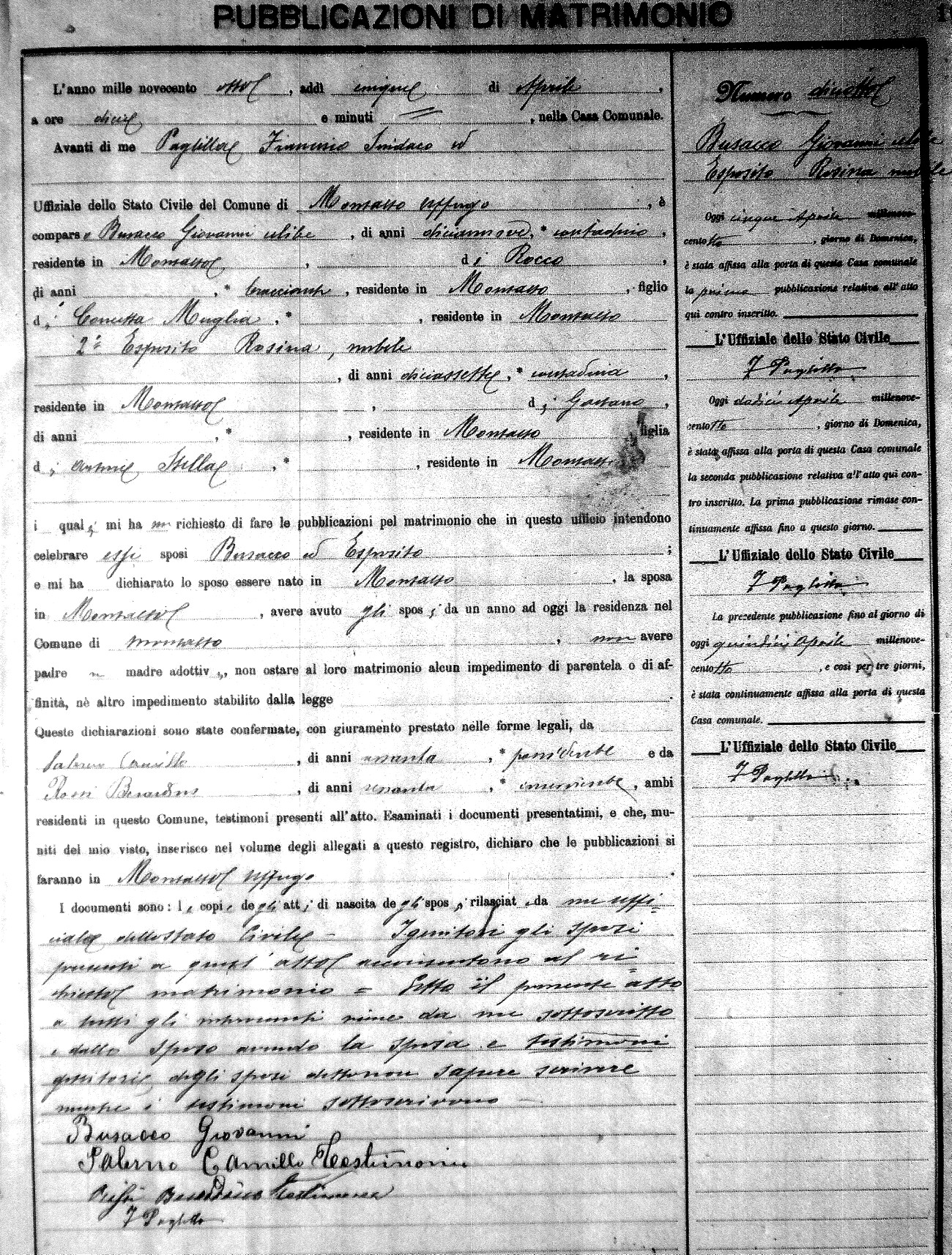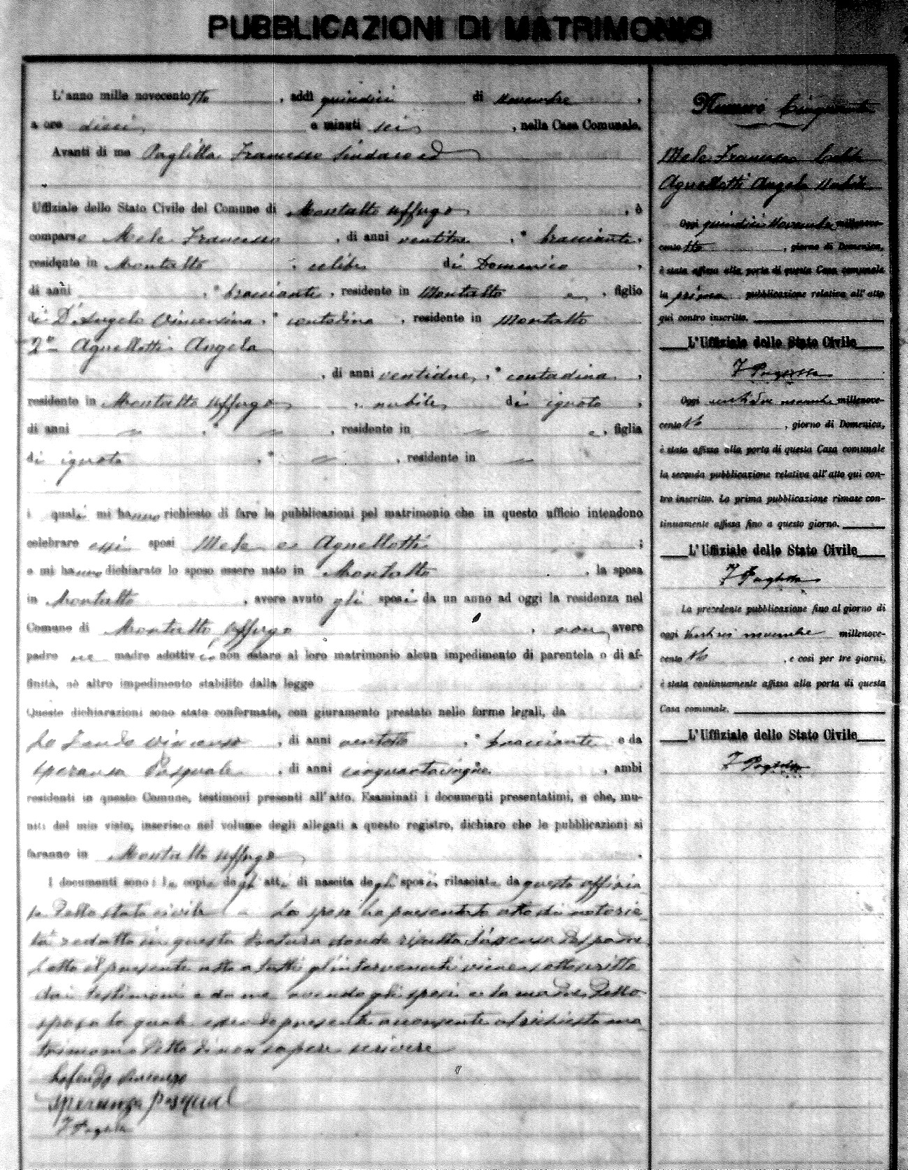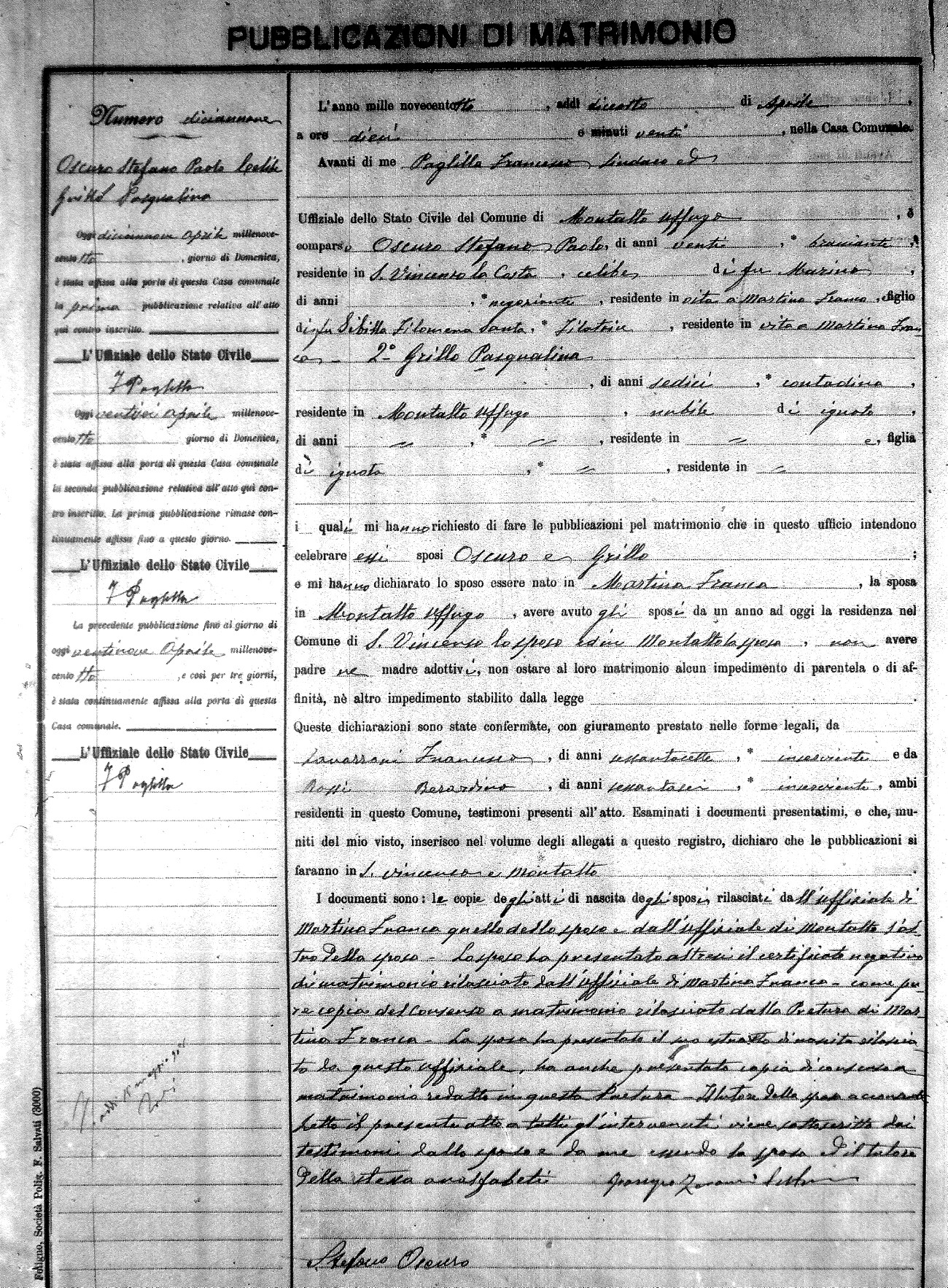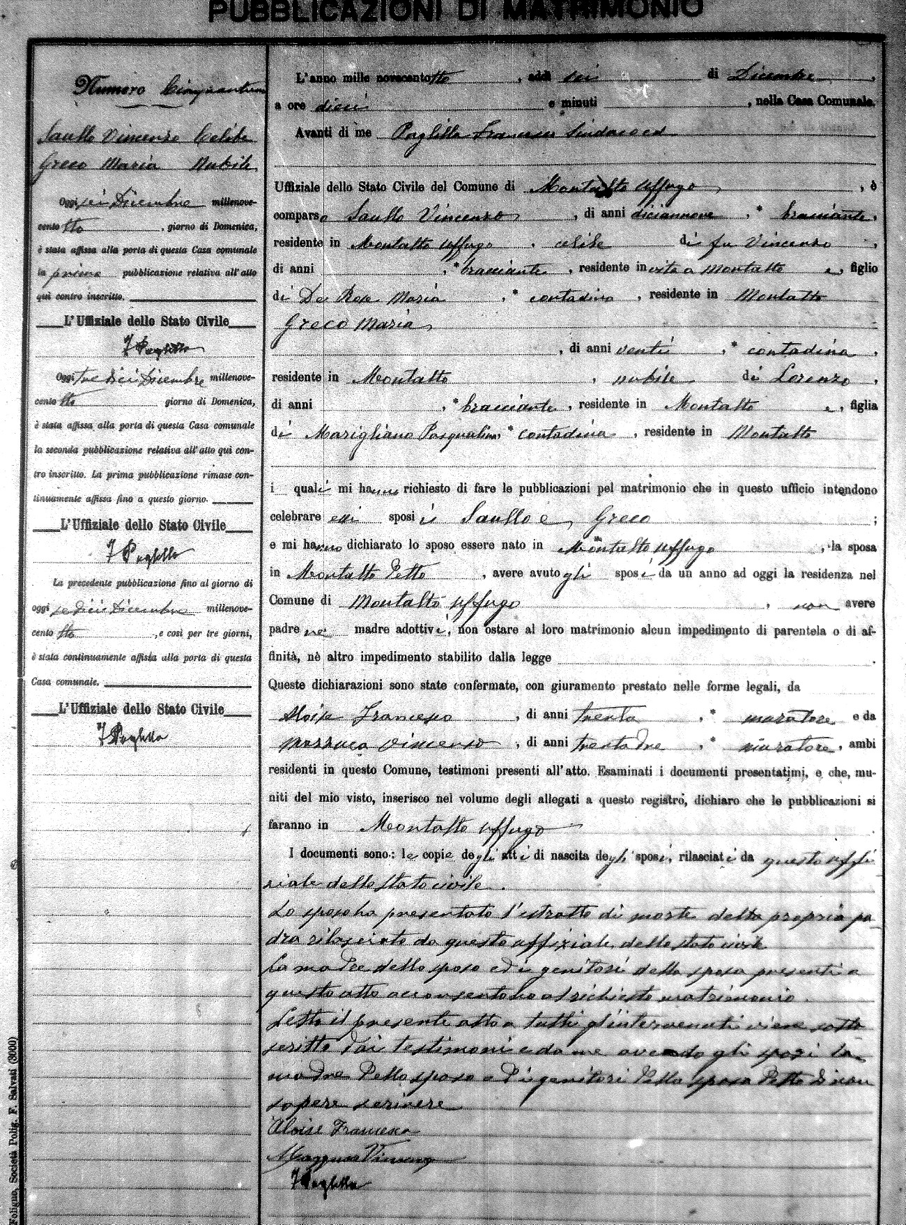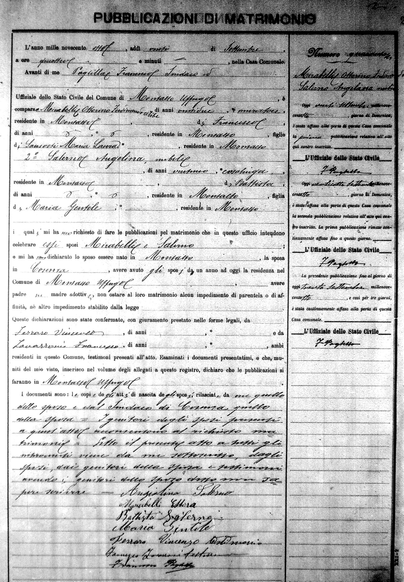 Here are the extractions for the marriage banns in 1908 for Montalto Uffugo. Each extraction has a link to a copy of the original document on the groom's surname. Please note: (fu) indicates the the person was deceased at the time of the marriage bann. For a translation of the basic Pubblicazioni document, look here.