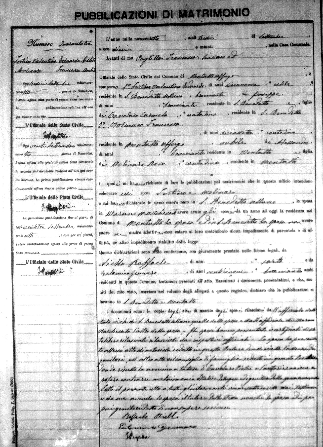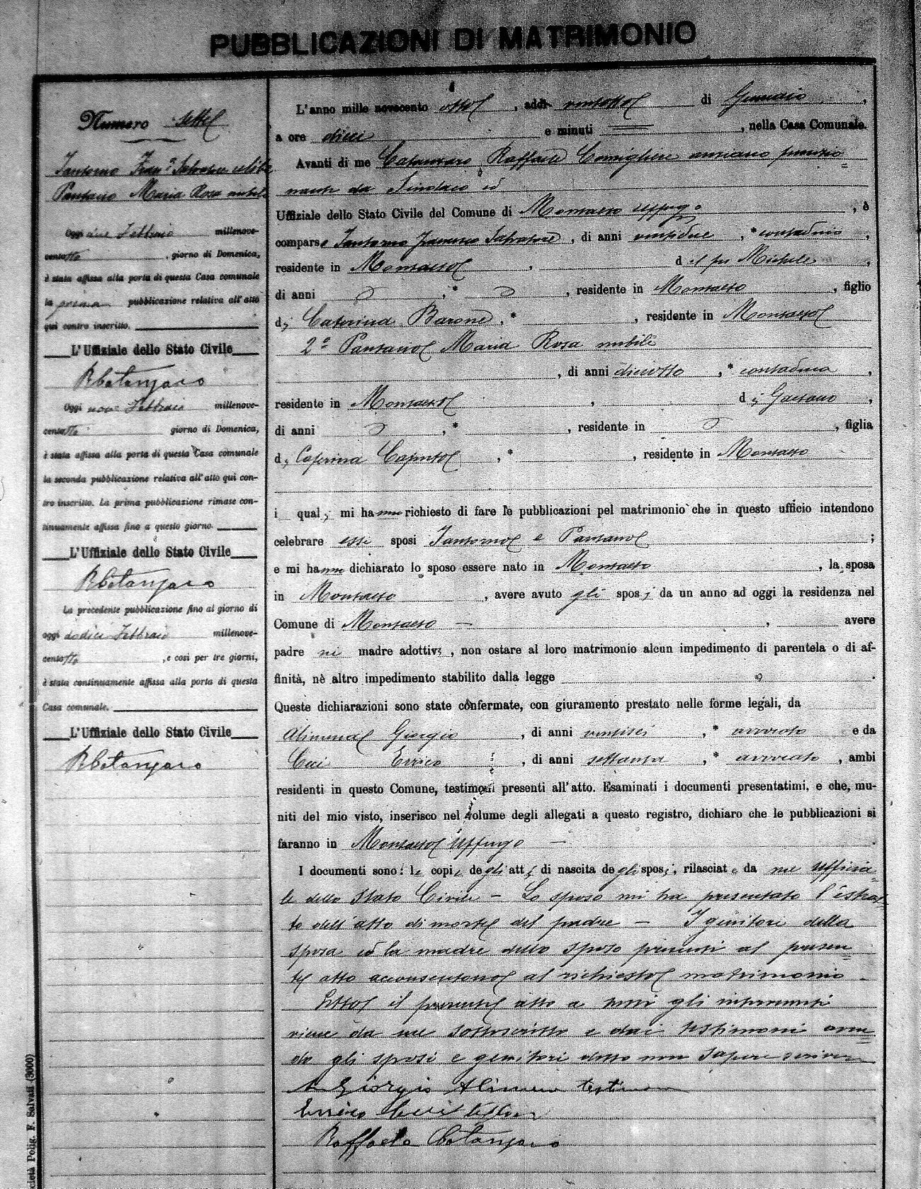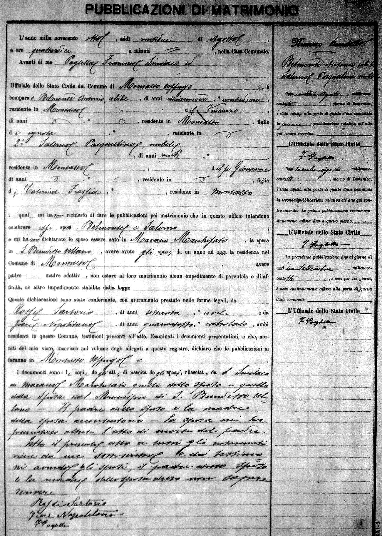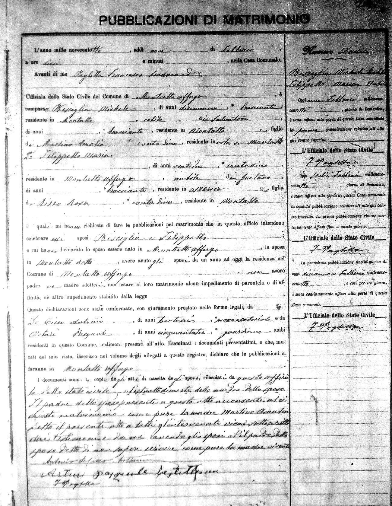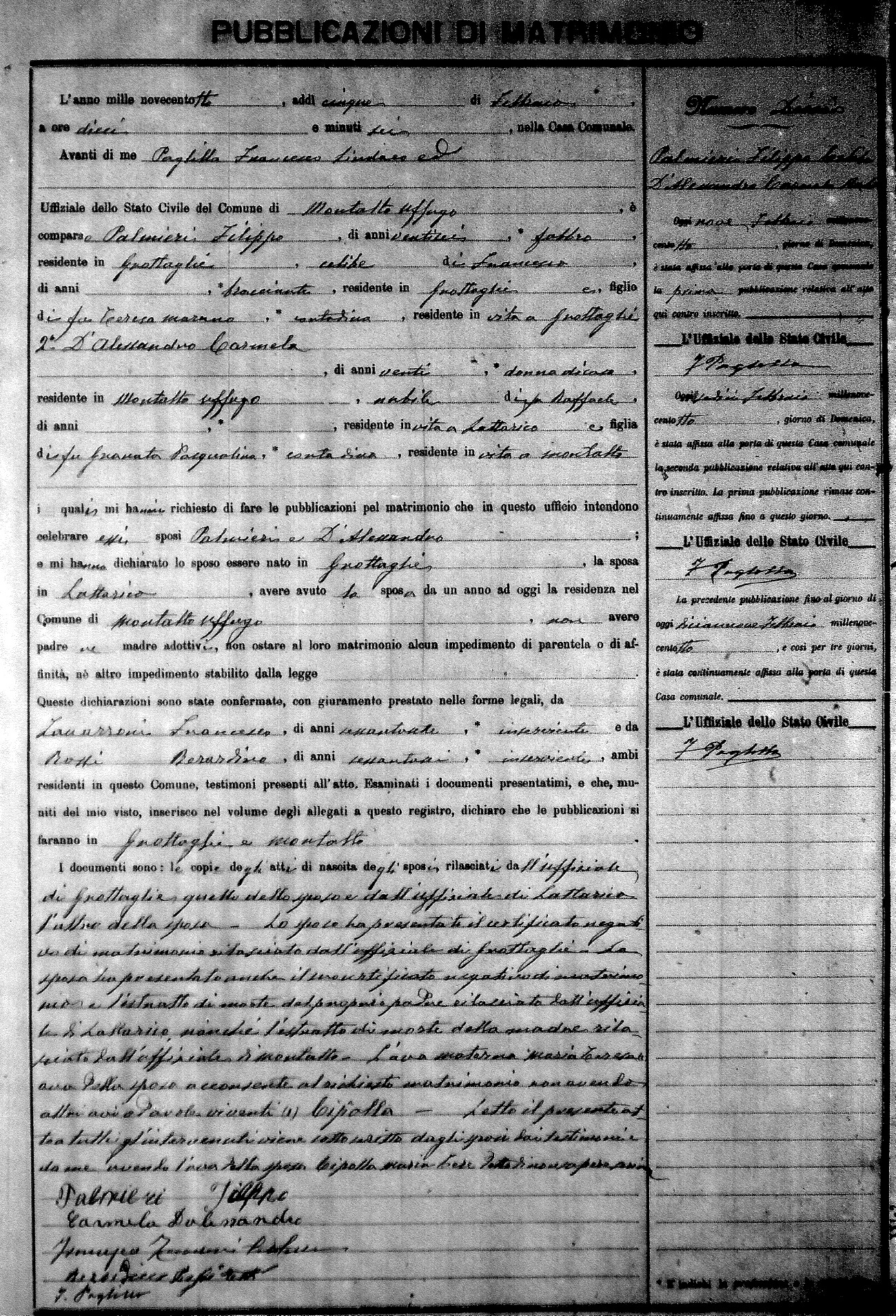 Here are the extractions for the marriage banns in 1908 for Montalto Uffugo. Each extraction has a link to a copy of the original document on the groom's surname. Please note: (fu) indicates the the person was deceased at the time of the marriage bann. For a translation of the basic Pubblicazioni document, look here.