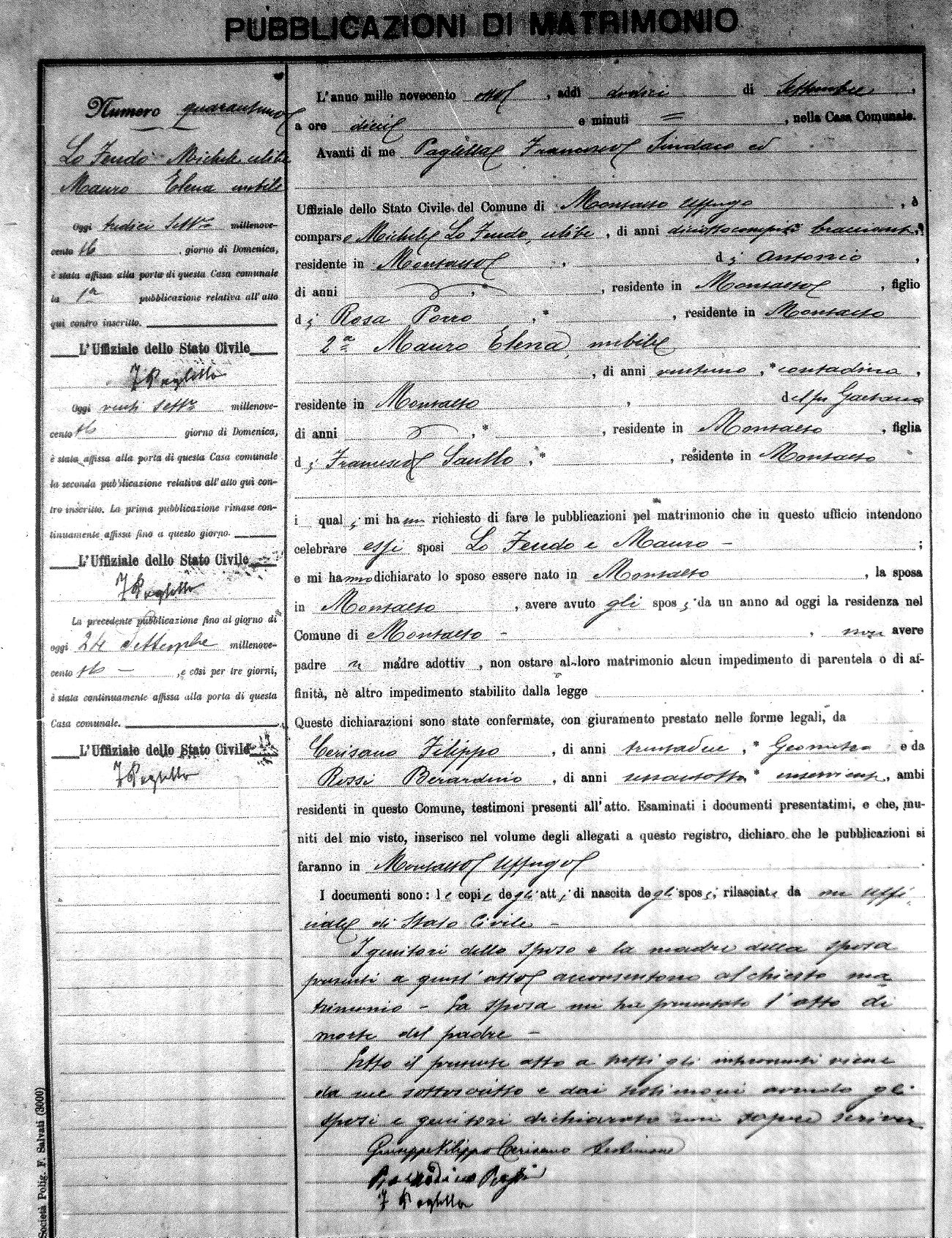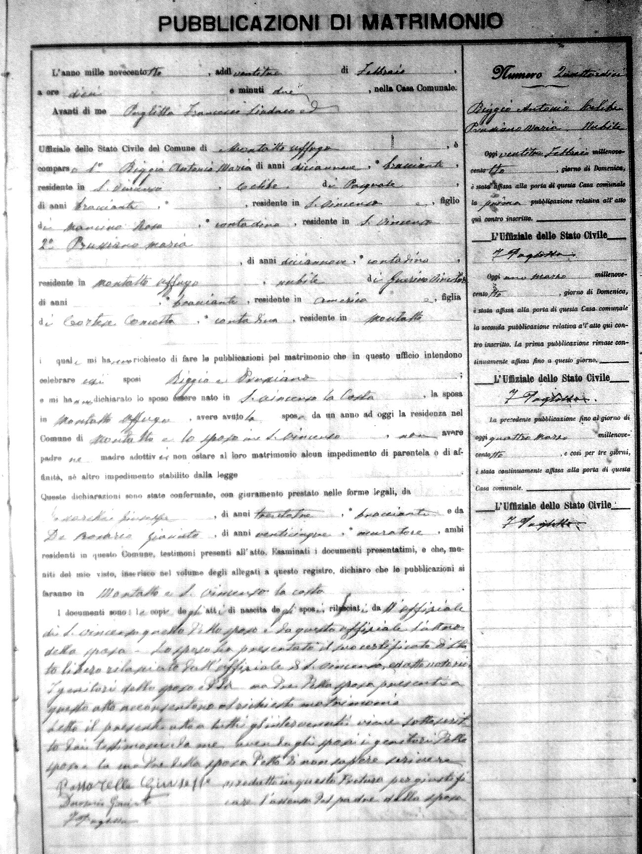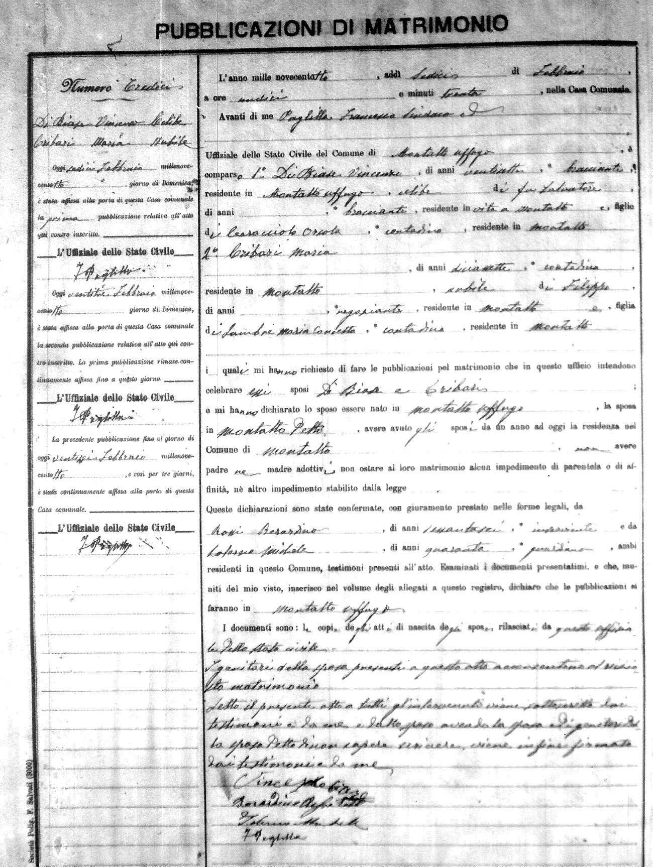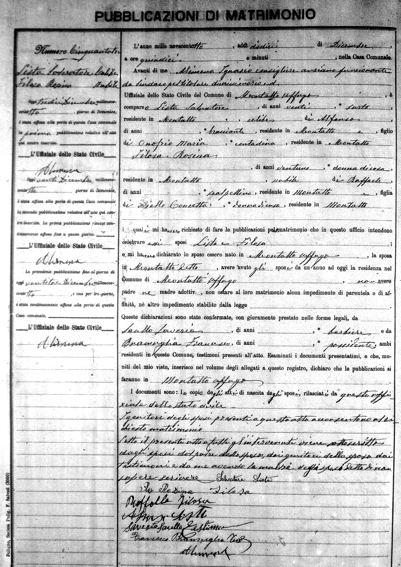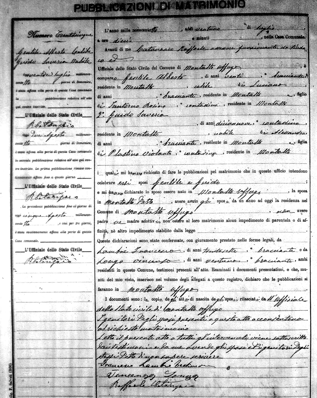 Here are the extractions for the marriage banns in 1908 for Montalto Uffugo. Each extraction has a link to a copy of the original document on the groom's surname. Please note: (fu) indicates the the person was deceased at the time of the marriage bann. For a translation of the basic Pubblicazioni document, look here.