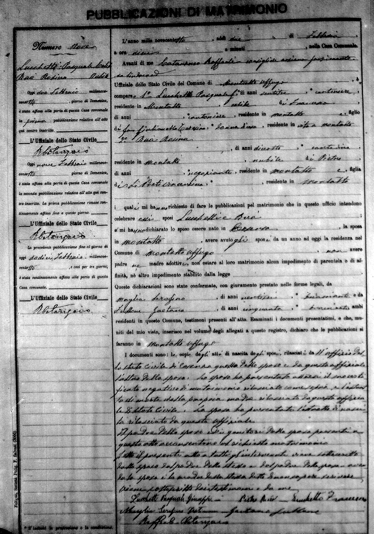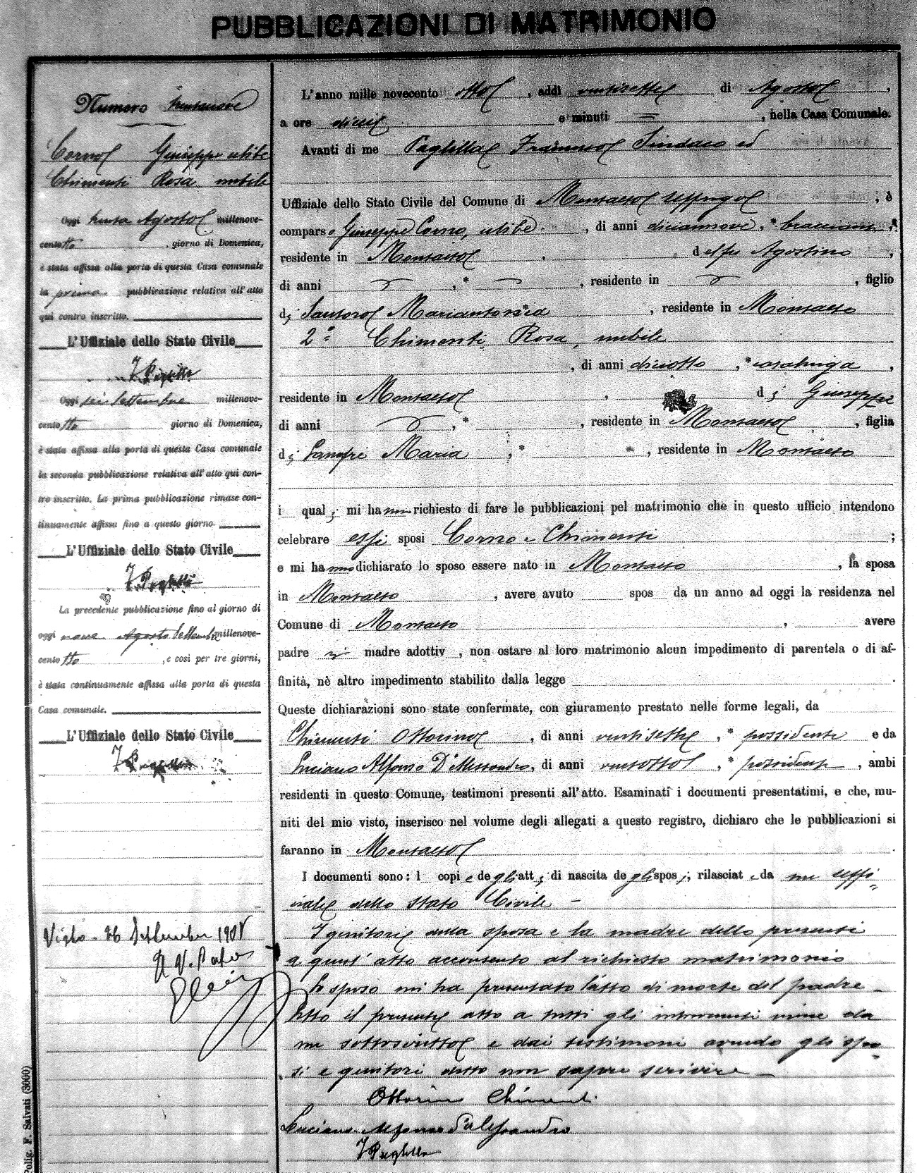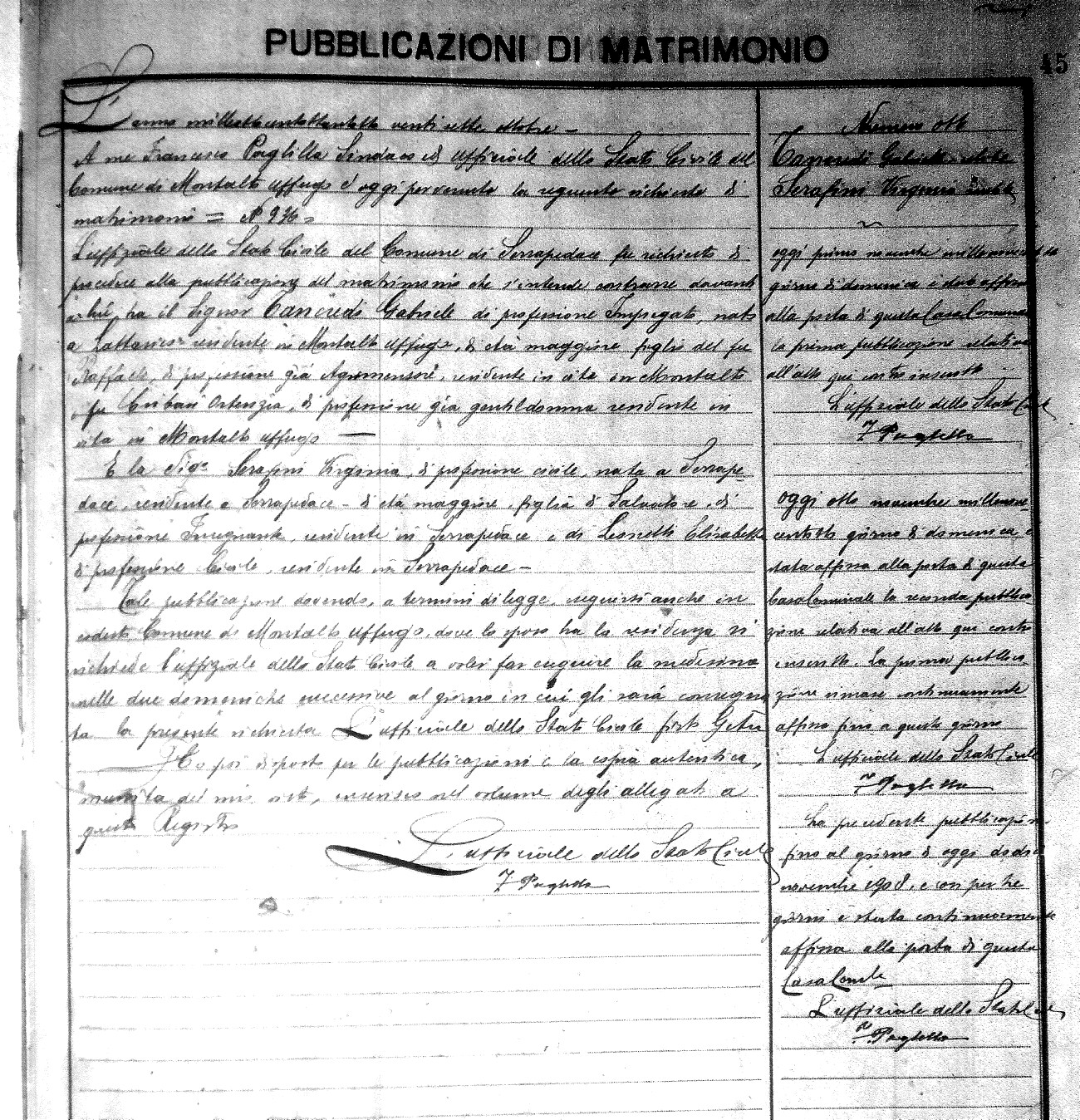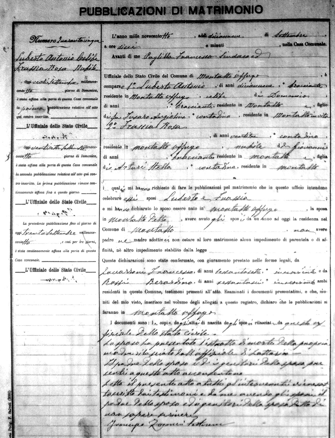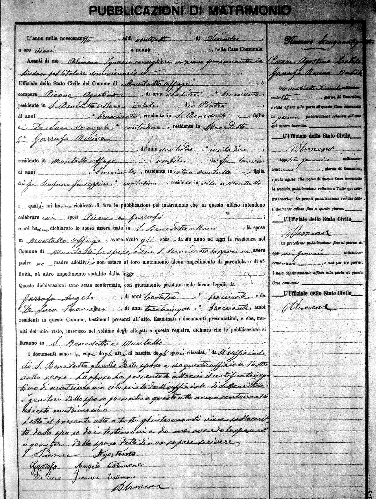 Here are the extractions for the marriage banns in 1908 for Montalto Uffugo. Each extraction has a link to a copy of the original document on the groom's surname. Please note: (fu) indicates the the person was deceased at the time of the marriage bann. For a translation of the basic Pubblicazioni document, look here.