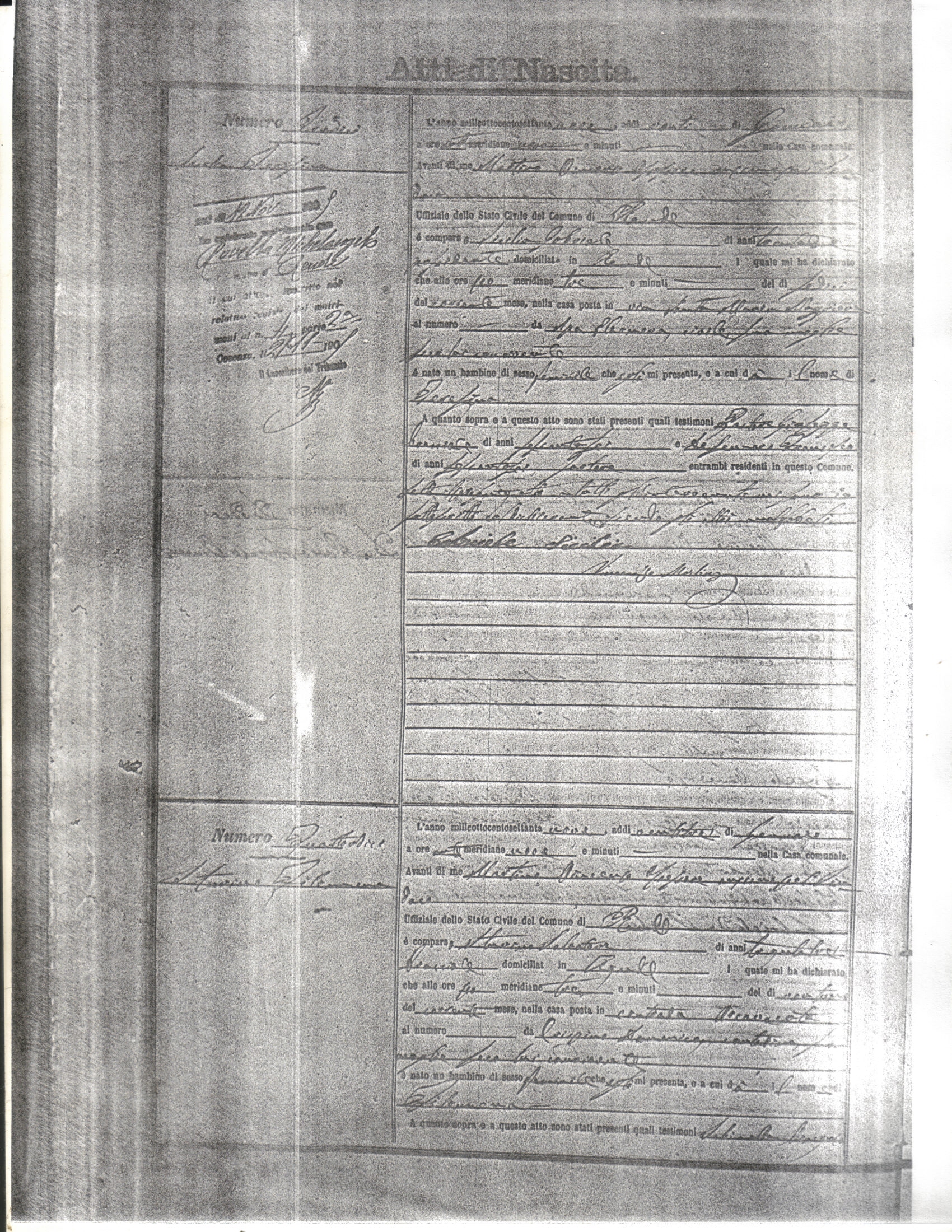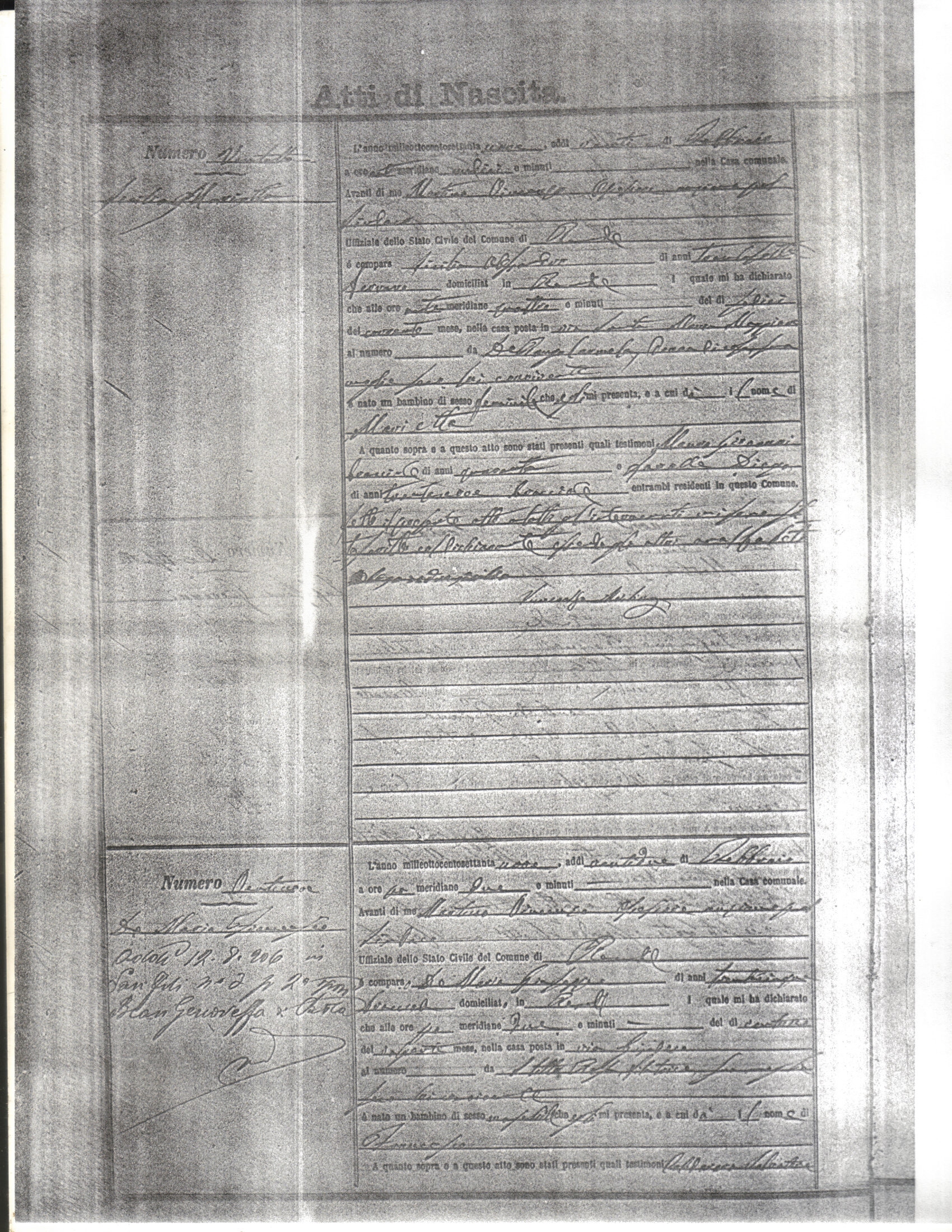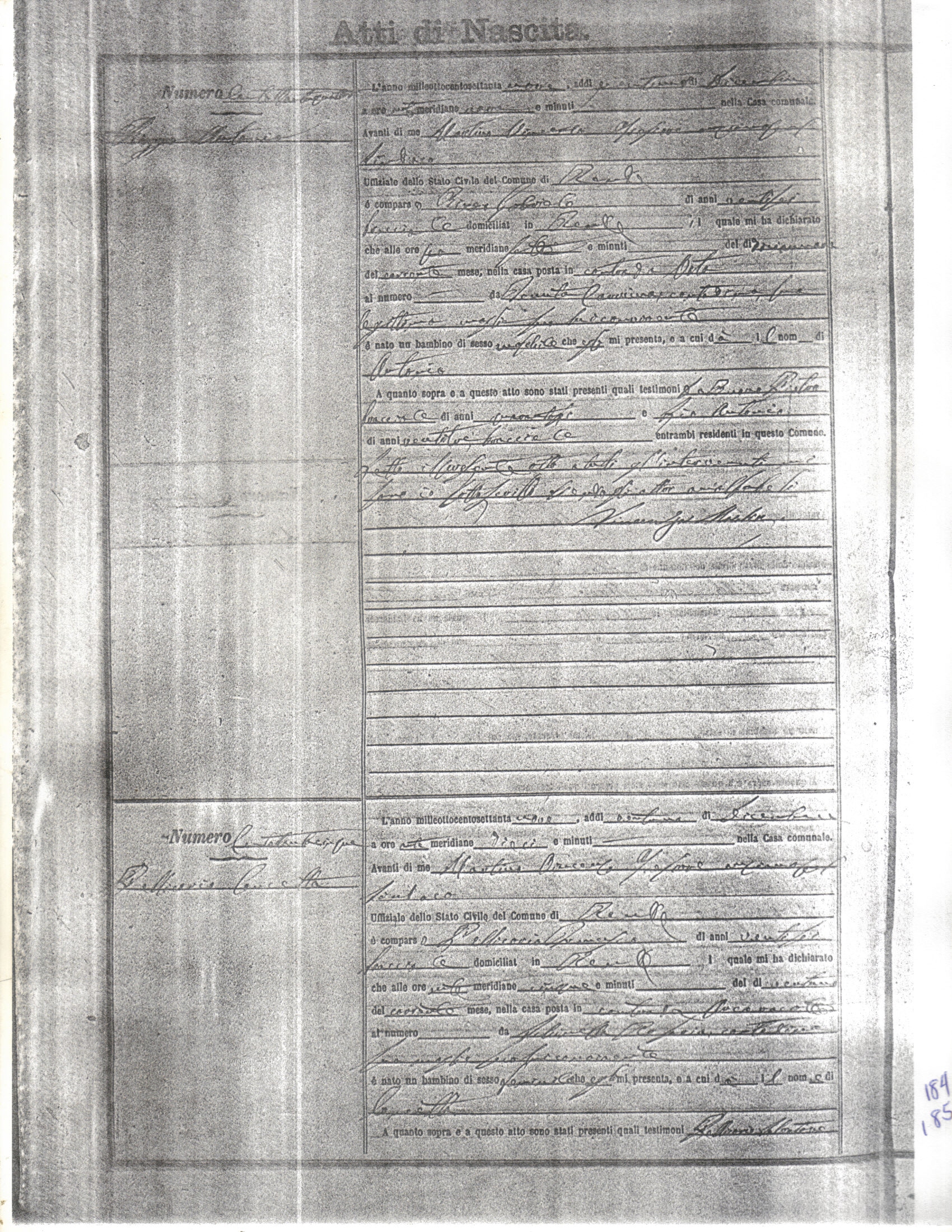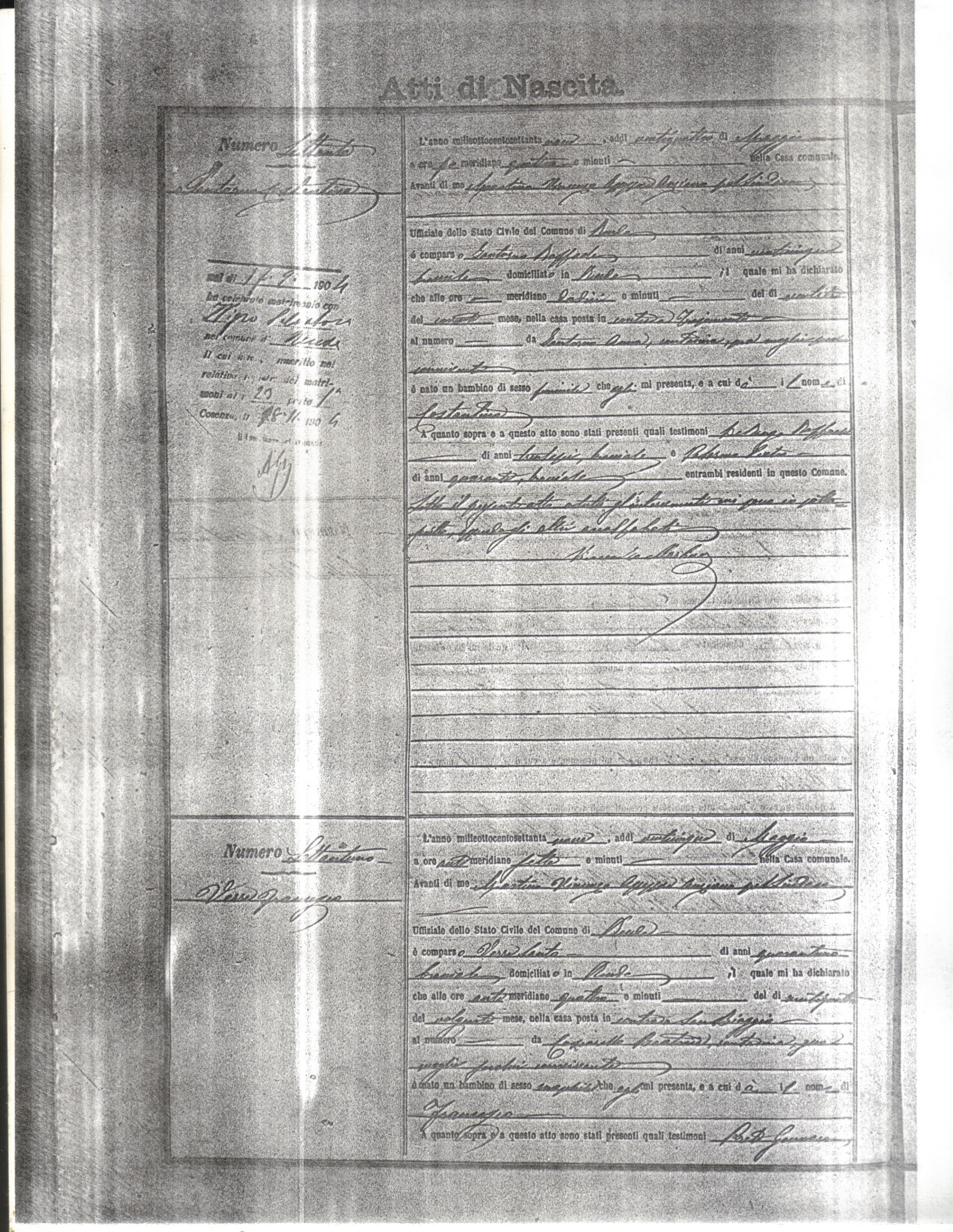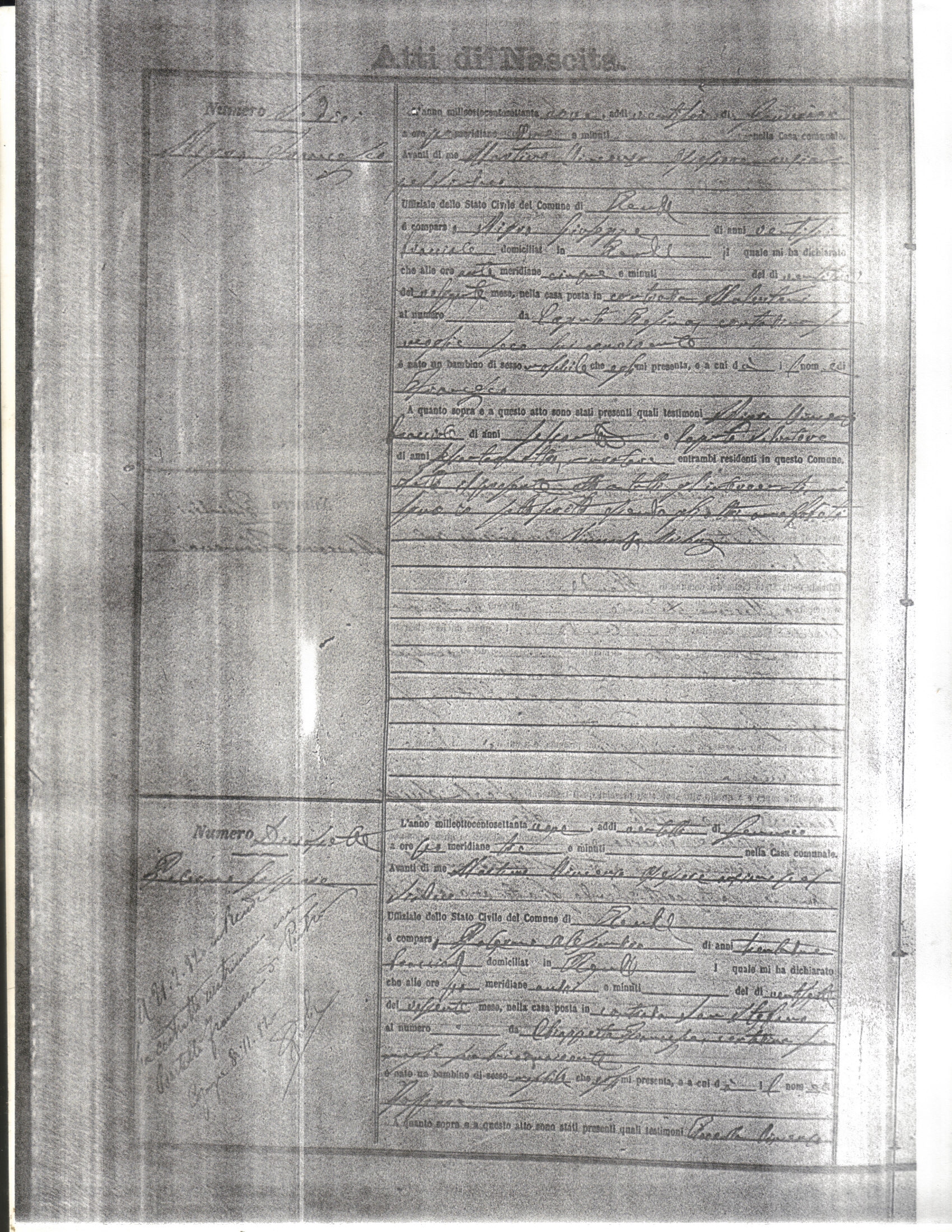 This page has the index to all the birth acts available for Rende That occured in 1879. The index give the atto (act) number which will be linked to a copy of the actual record on the table below. Please be patient while we get these records up. For a translation of the birth act form, visit our sister site, Montalto Uffugo.Net.