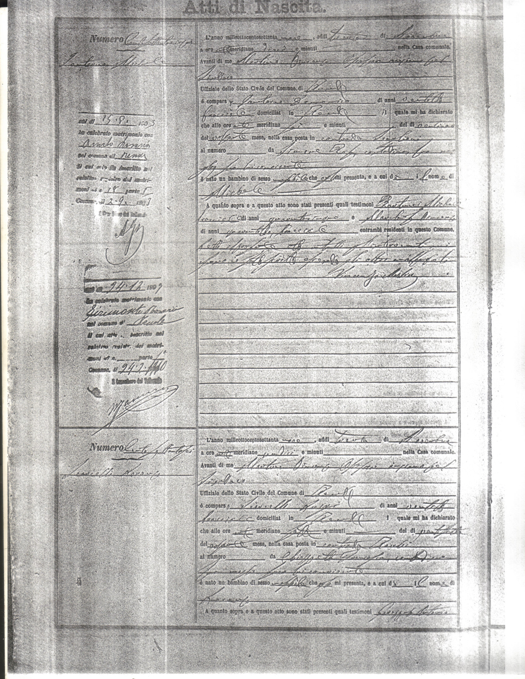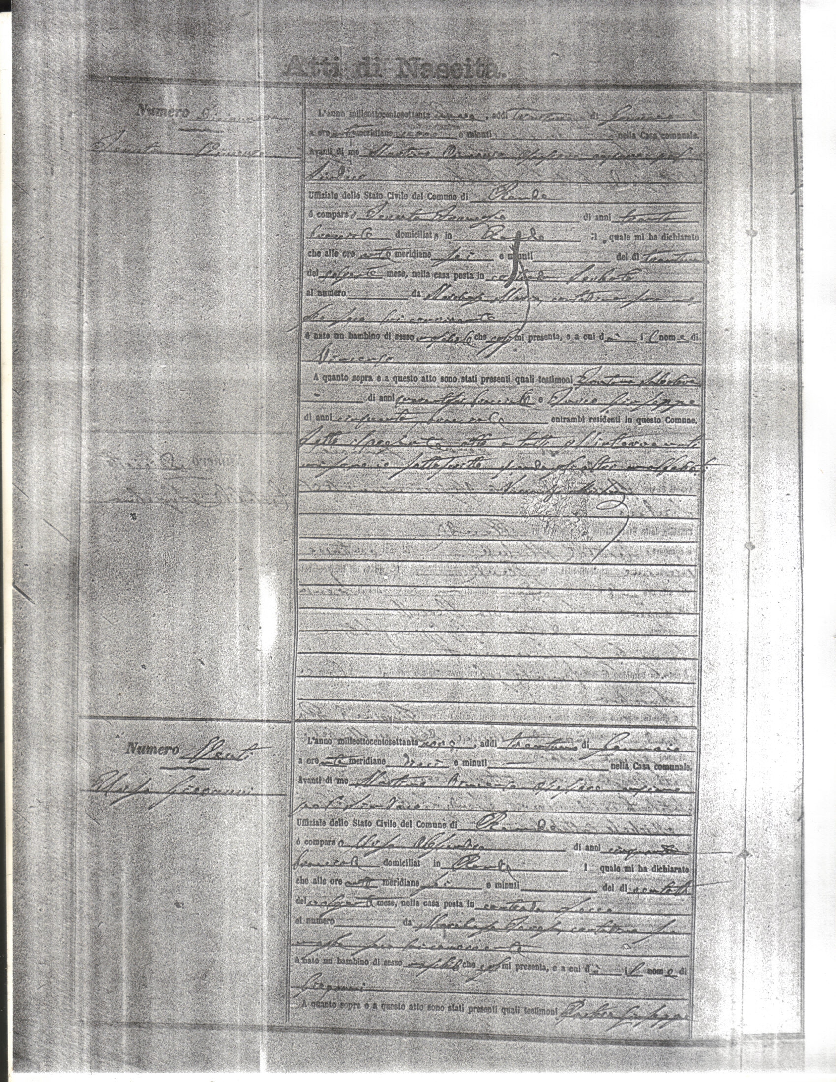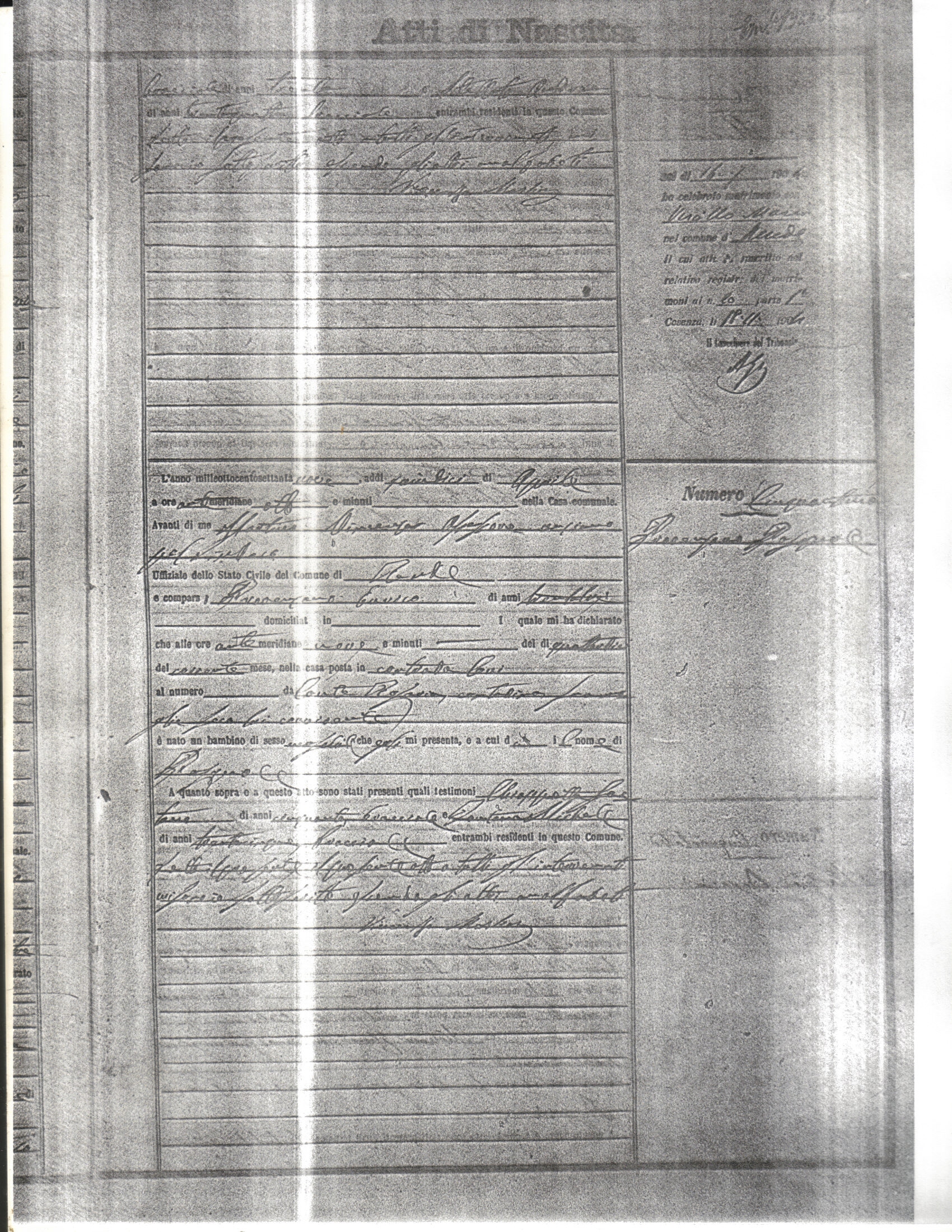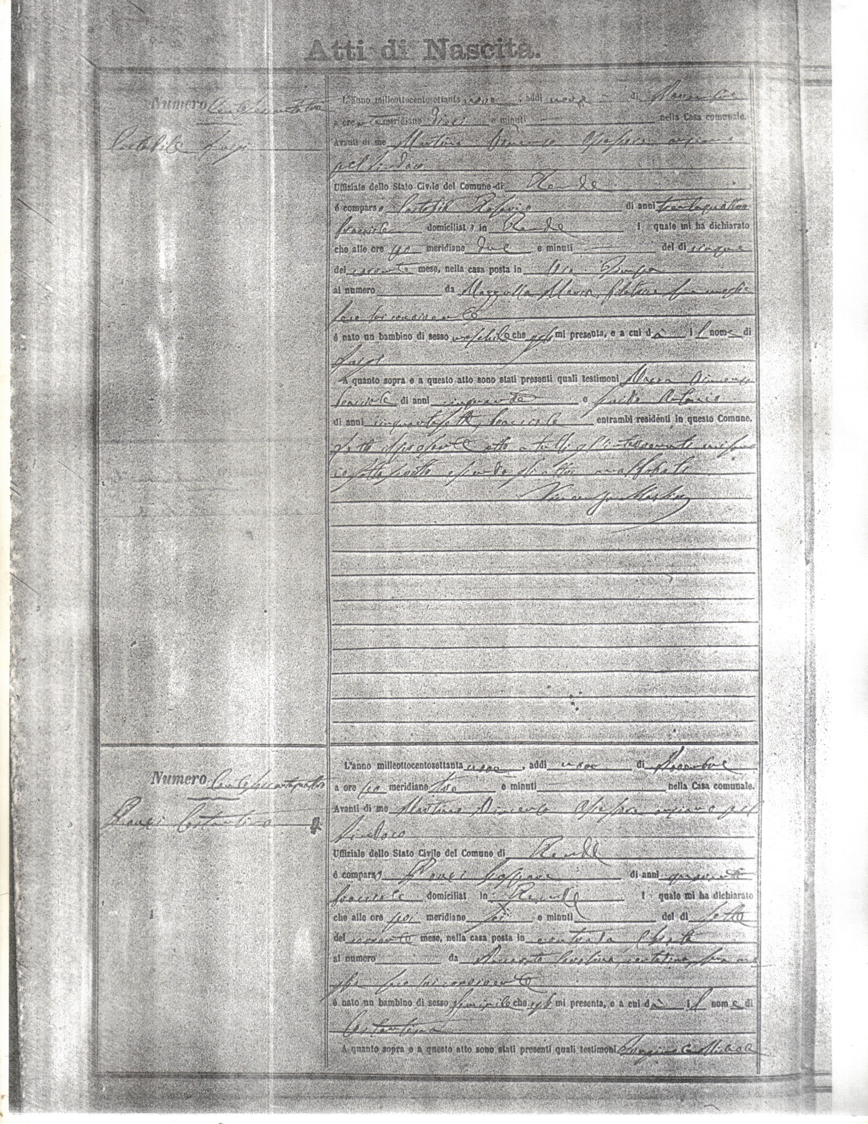 This page has the index to all the birth acts available for Rende That occured in 1879. The index give the atto (act) number which will be linked to a copy of the actual record on the table below. Please be patient while we get these records up. For a translation of the birth act form, visit our sister site, Montalto Uffugo.Net.