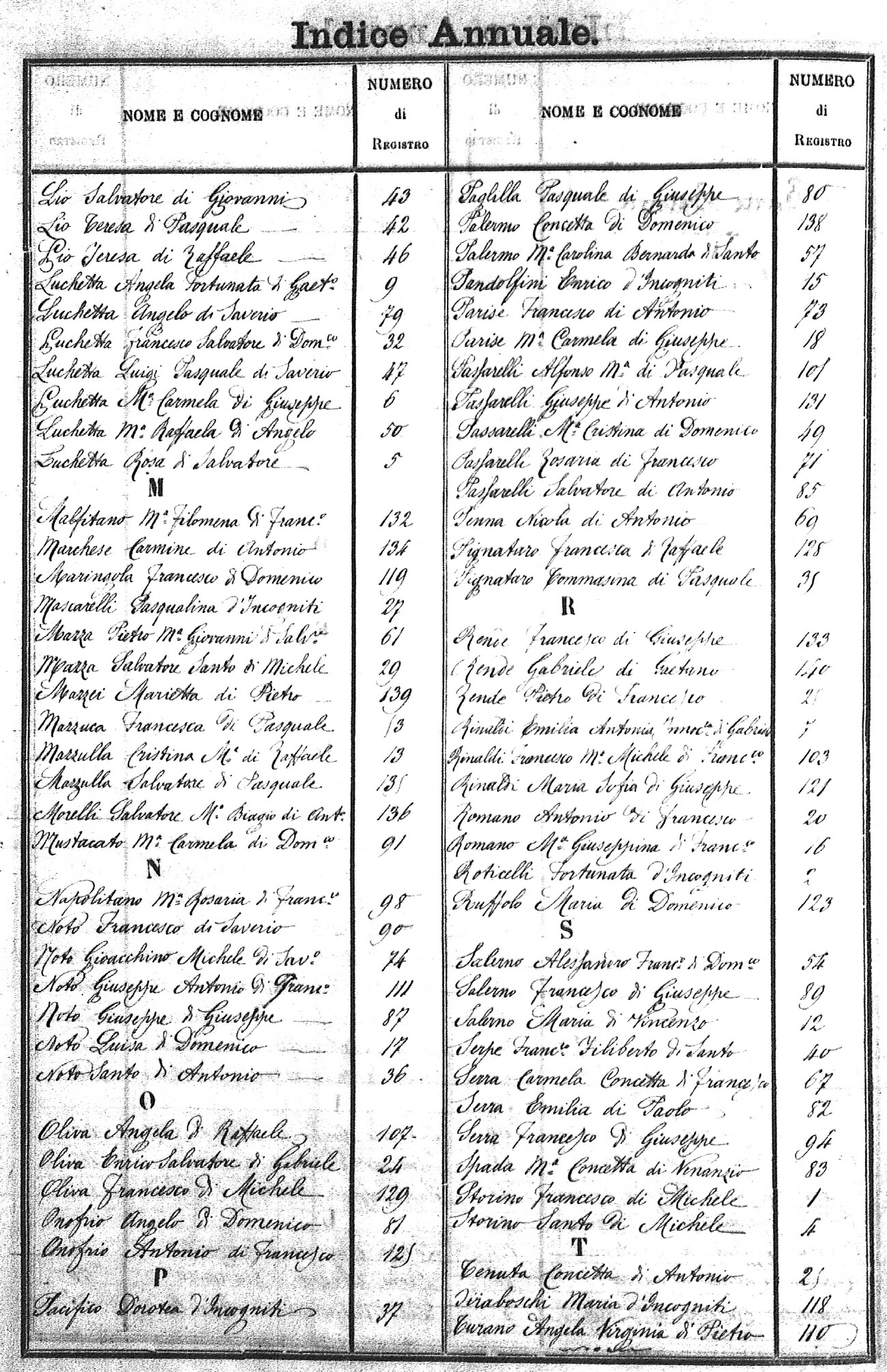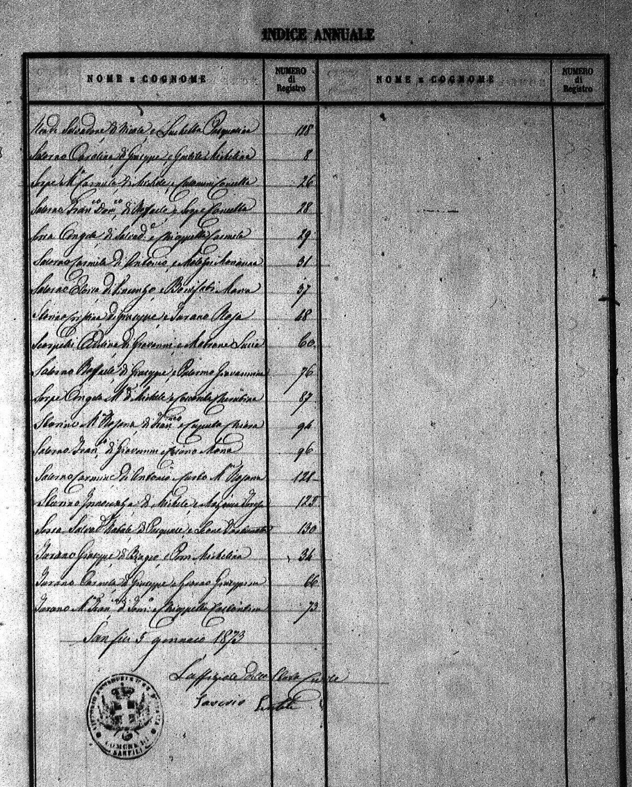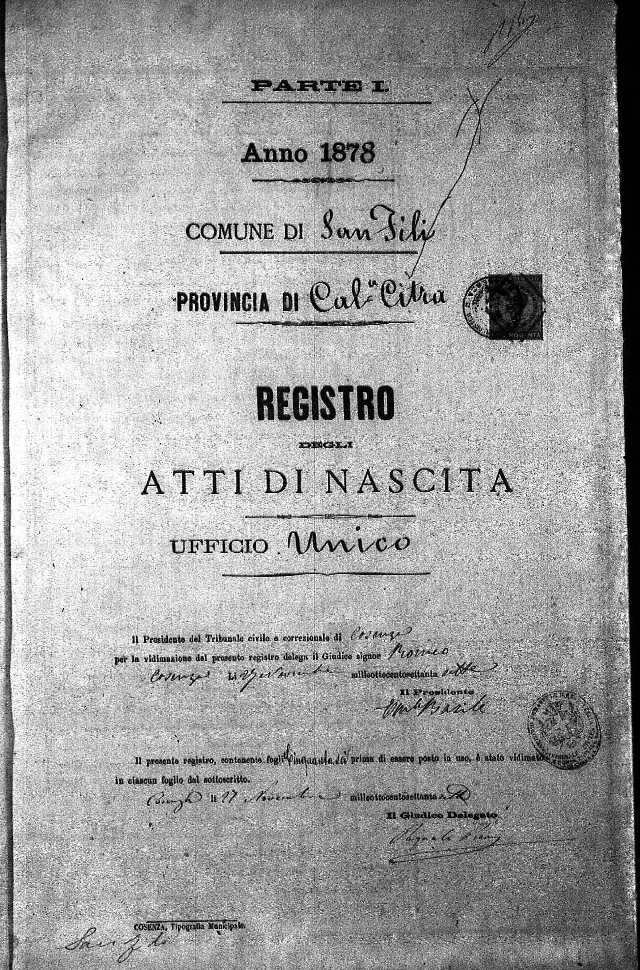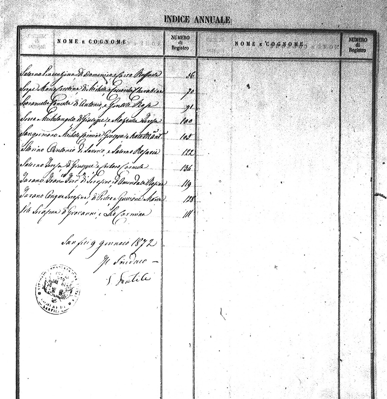 Indexes for birth Acts filed in the State Civil Office of San Fili. The Indexes are in alphabetical order by surname and contain the child's name, the mother's name, the father's name and the act number. The birth years available are listed below.