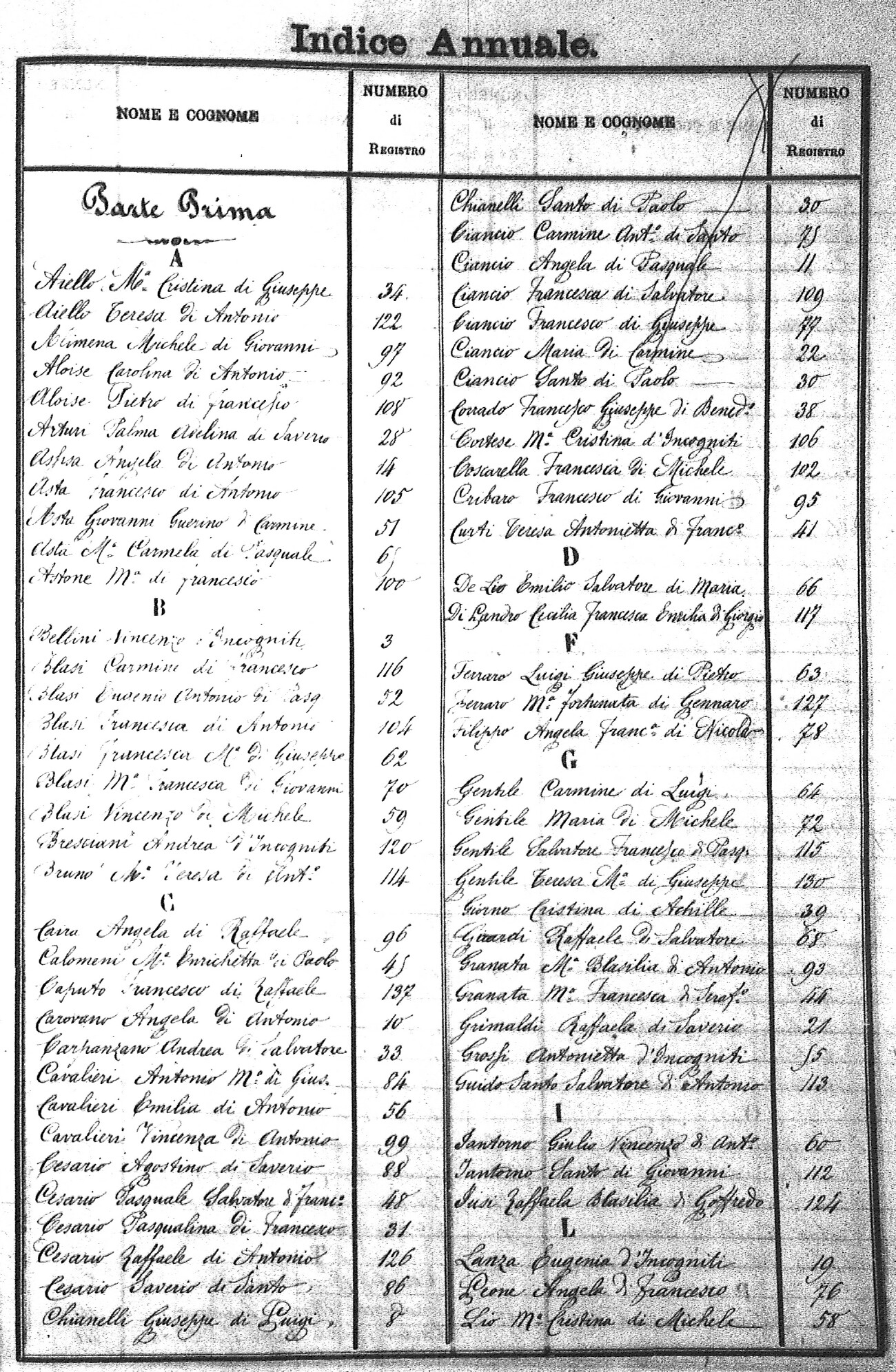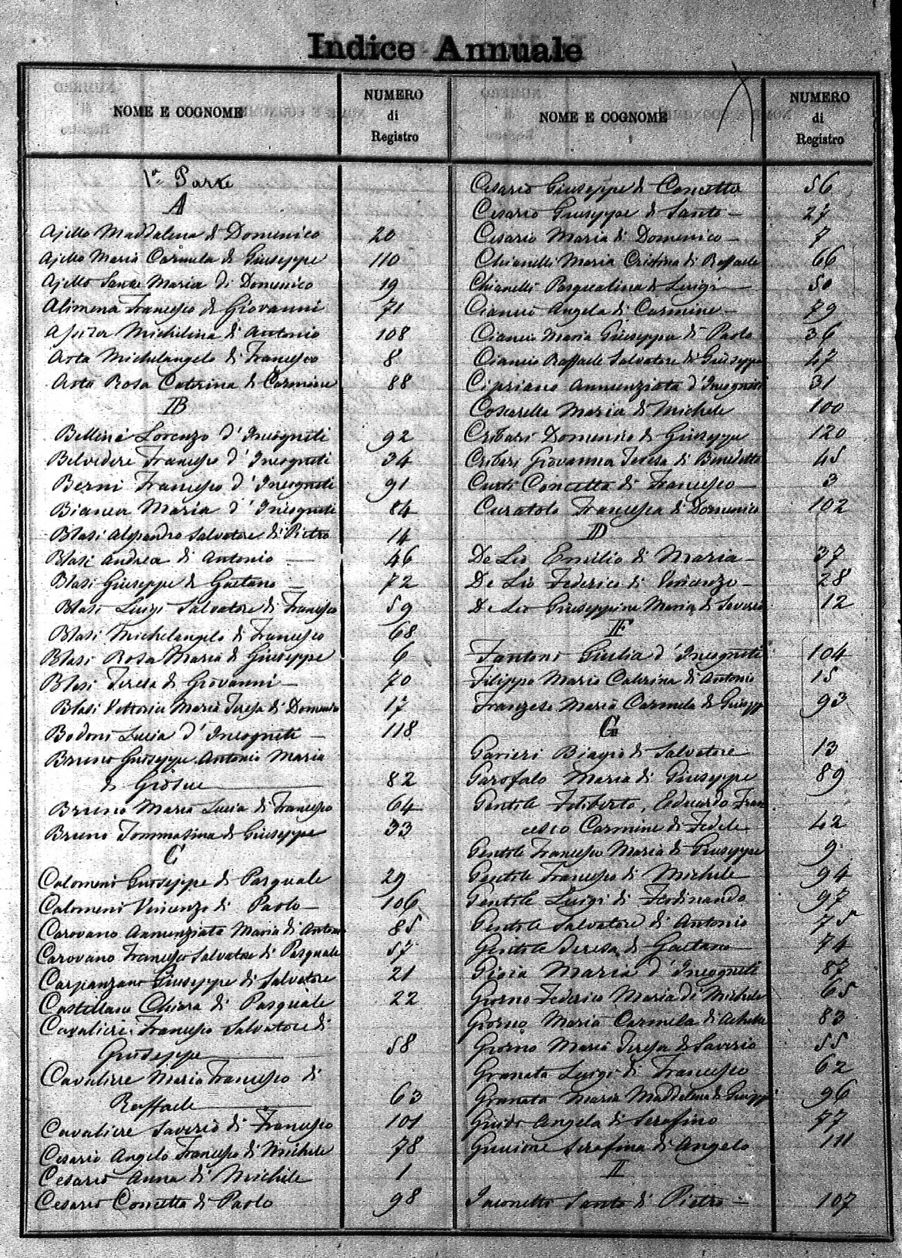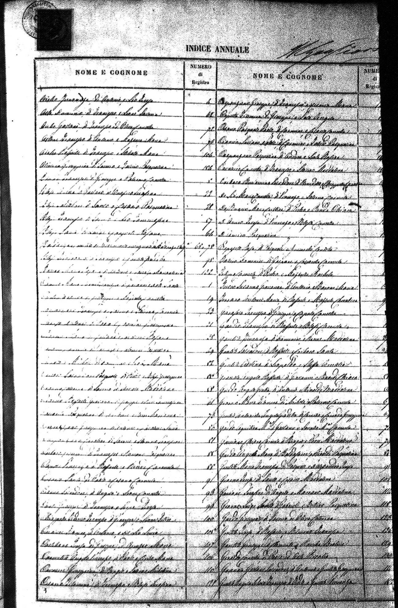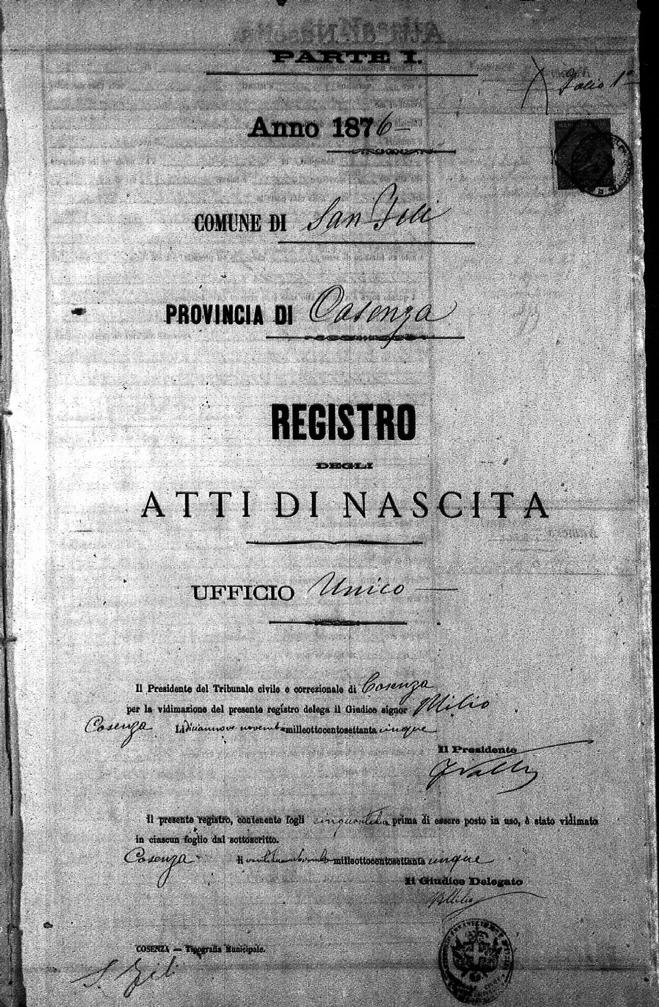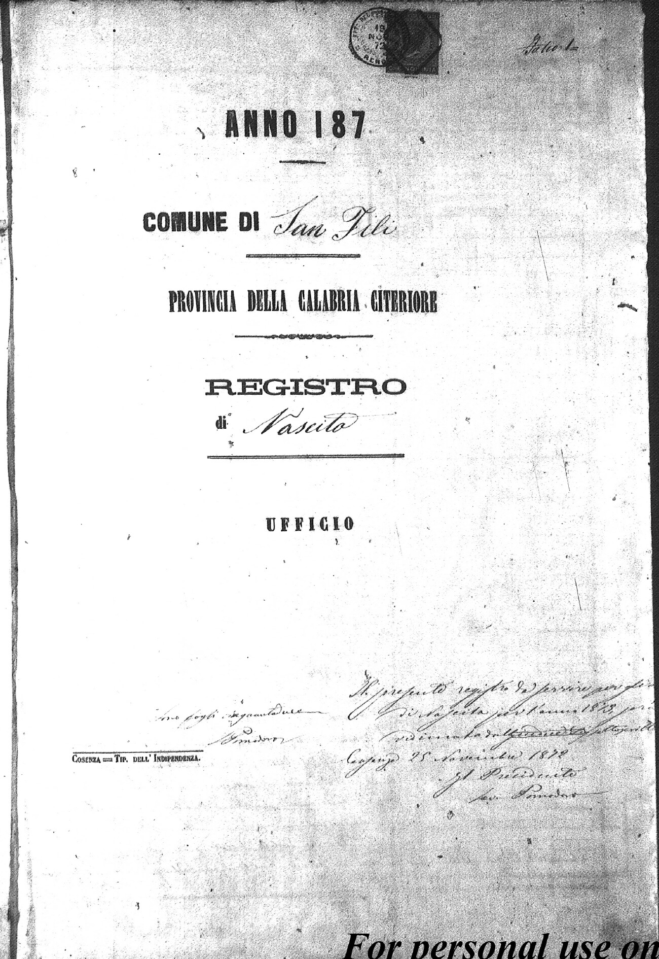 Indexes for birth Acts filed in the State Civil Office of San Fili. The Indexes are in alphabetical order by surname and contain the child's name, the mother's name, the father's name and the act number. The birth years available are listed below.