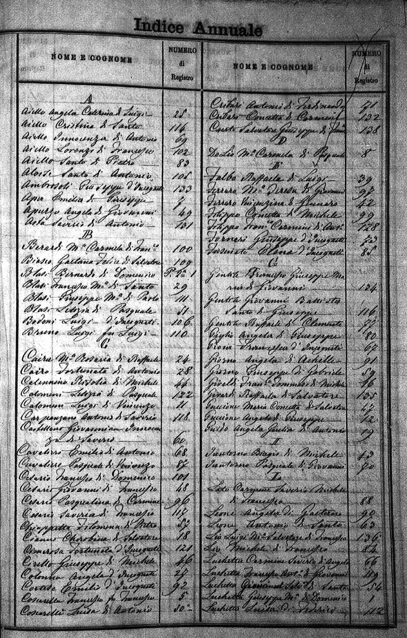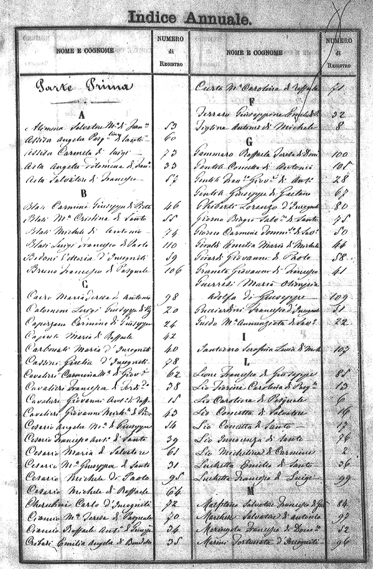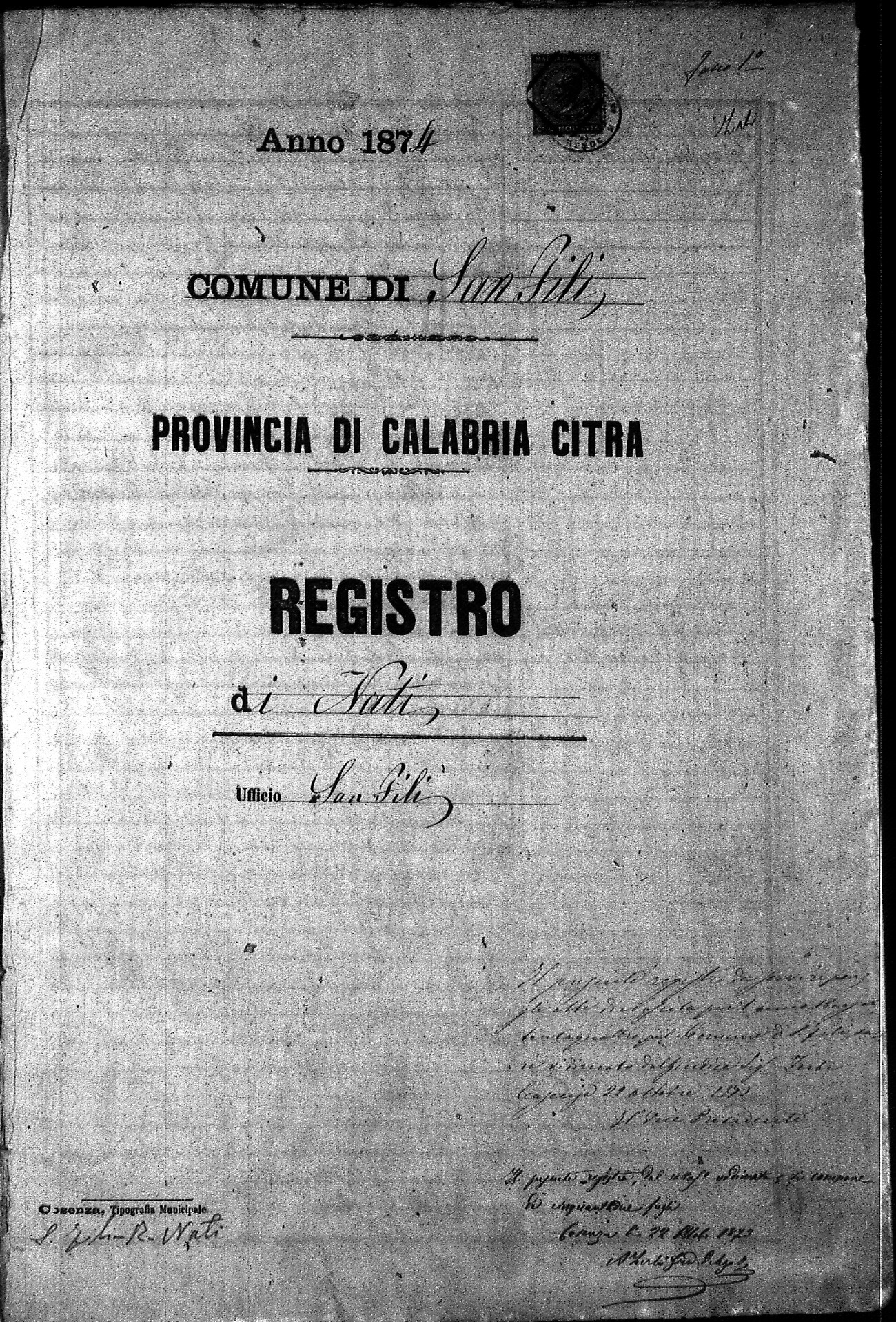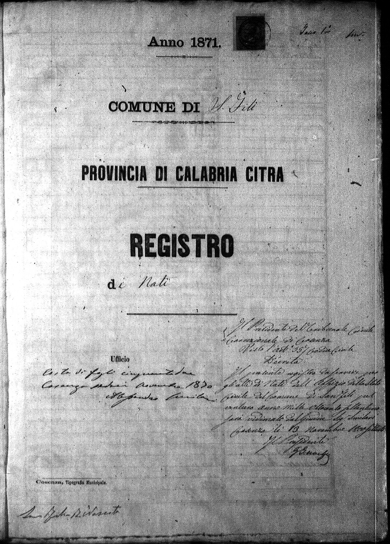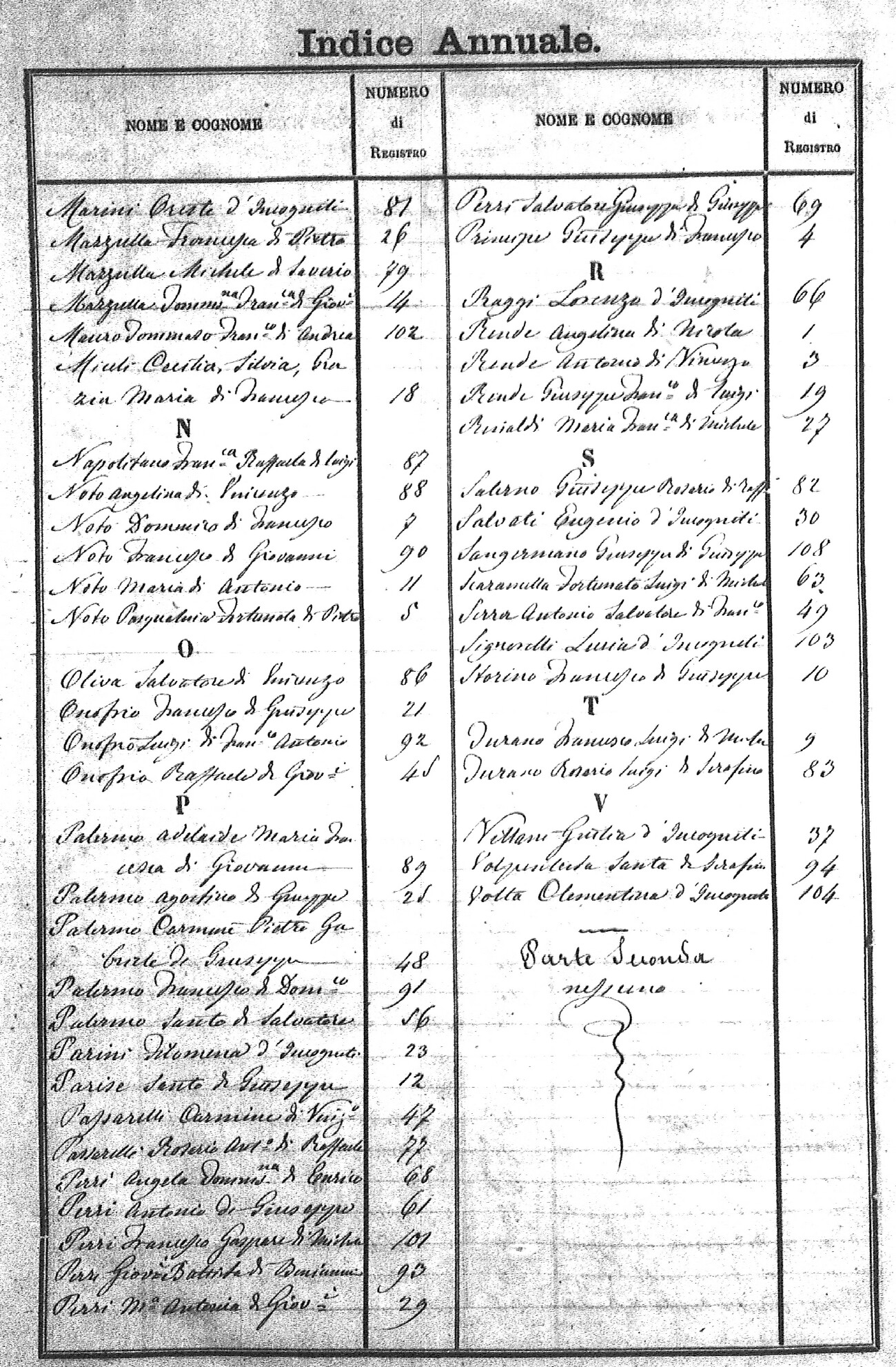 Indexes for birth Acts filed in the State Civil Office of San Fili. The Indexes are in alphabetical order by surname and contain the child's name, the mother's name, the father's name and the act number. The birth years available are listed below.
