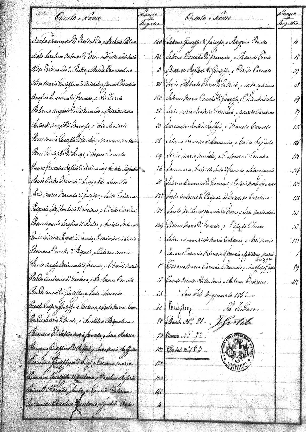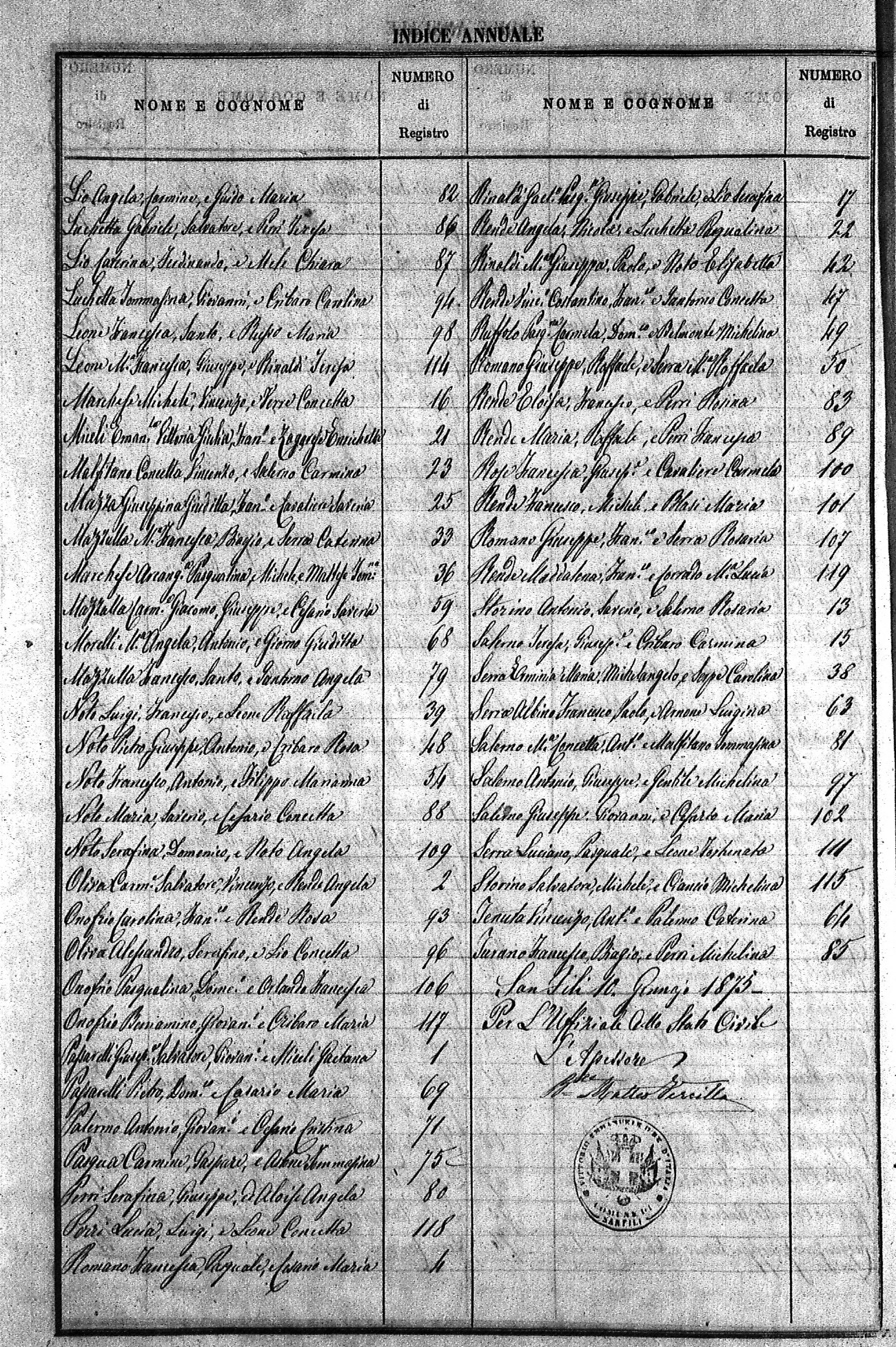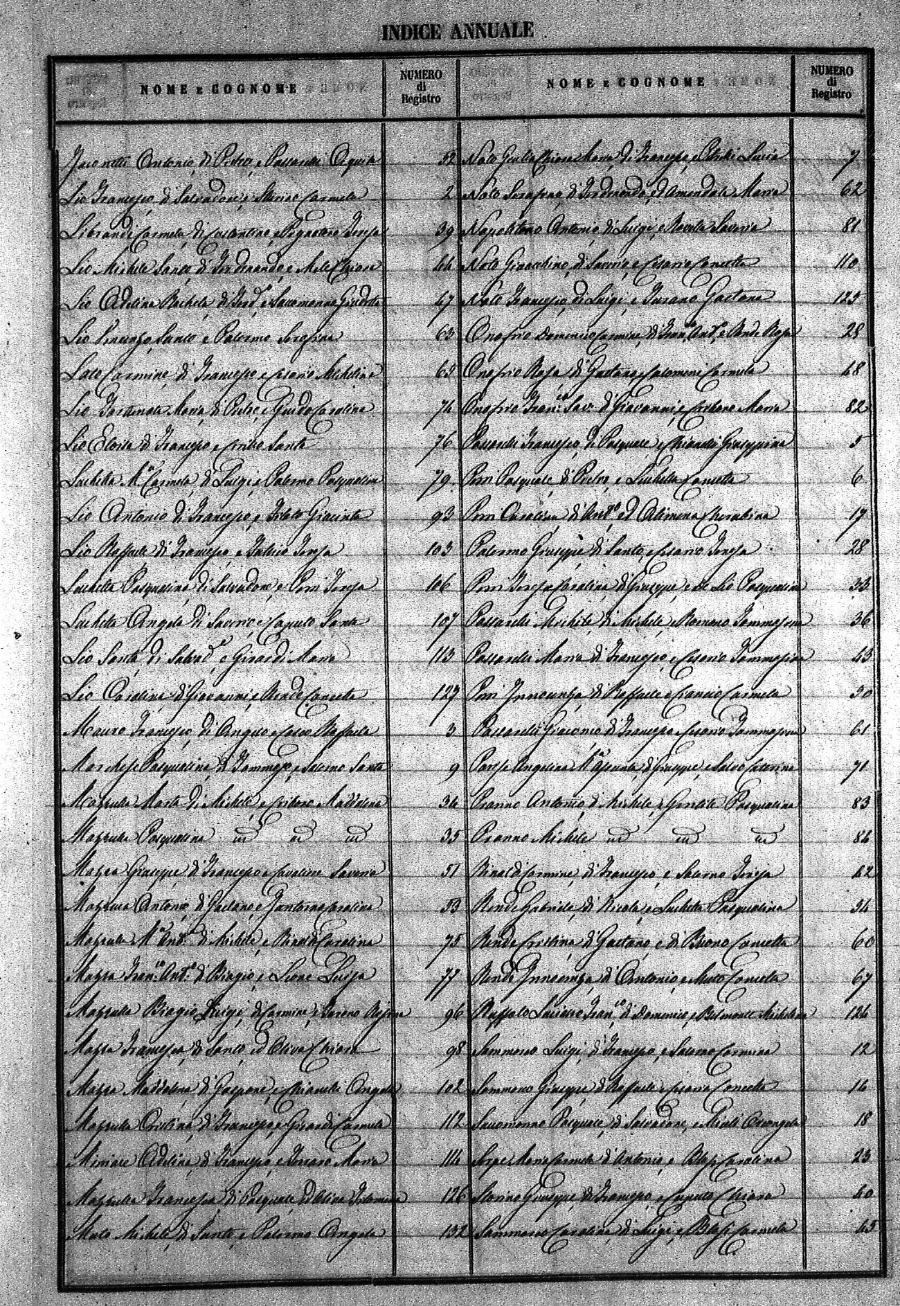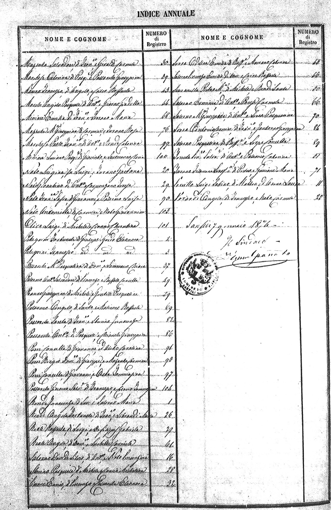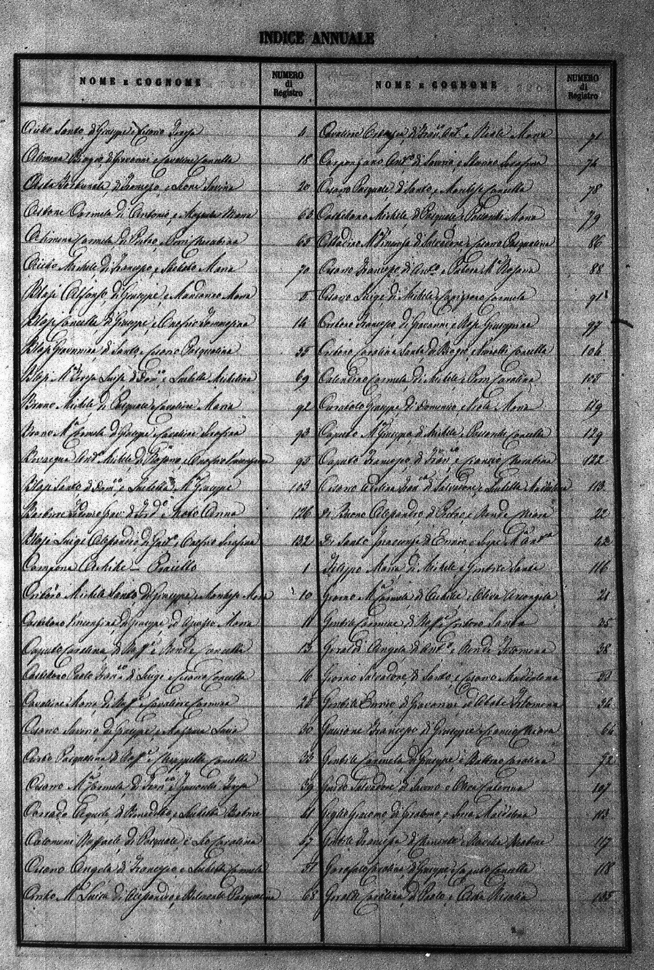 Indexes for birth Acts filed in the State Civil Office of San Fili. The Indexes are in alphabetical order by surname and contain the child's name, the mother's name, the father's name and the act number. The birth years available are listed below.