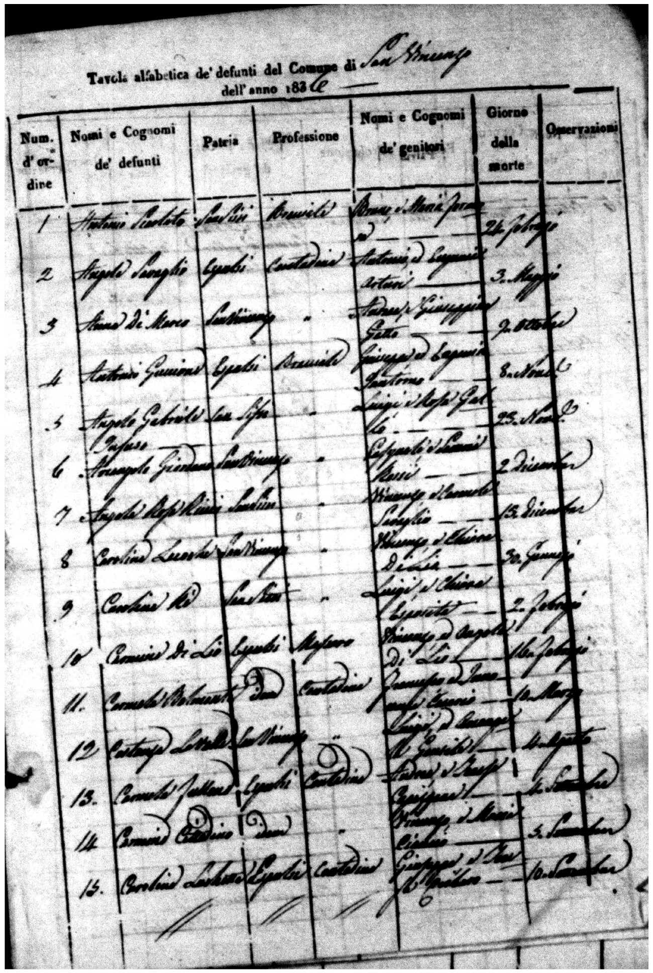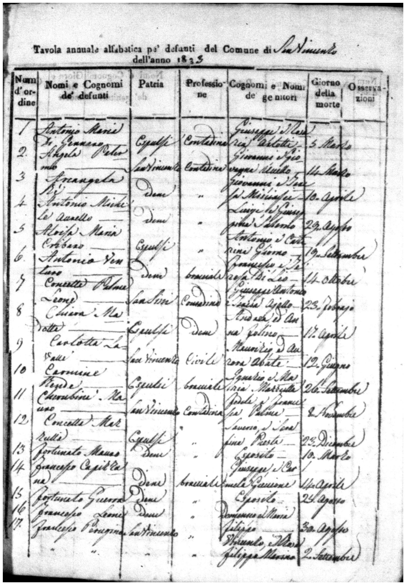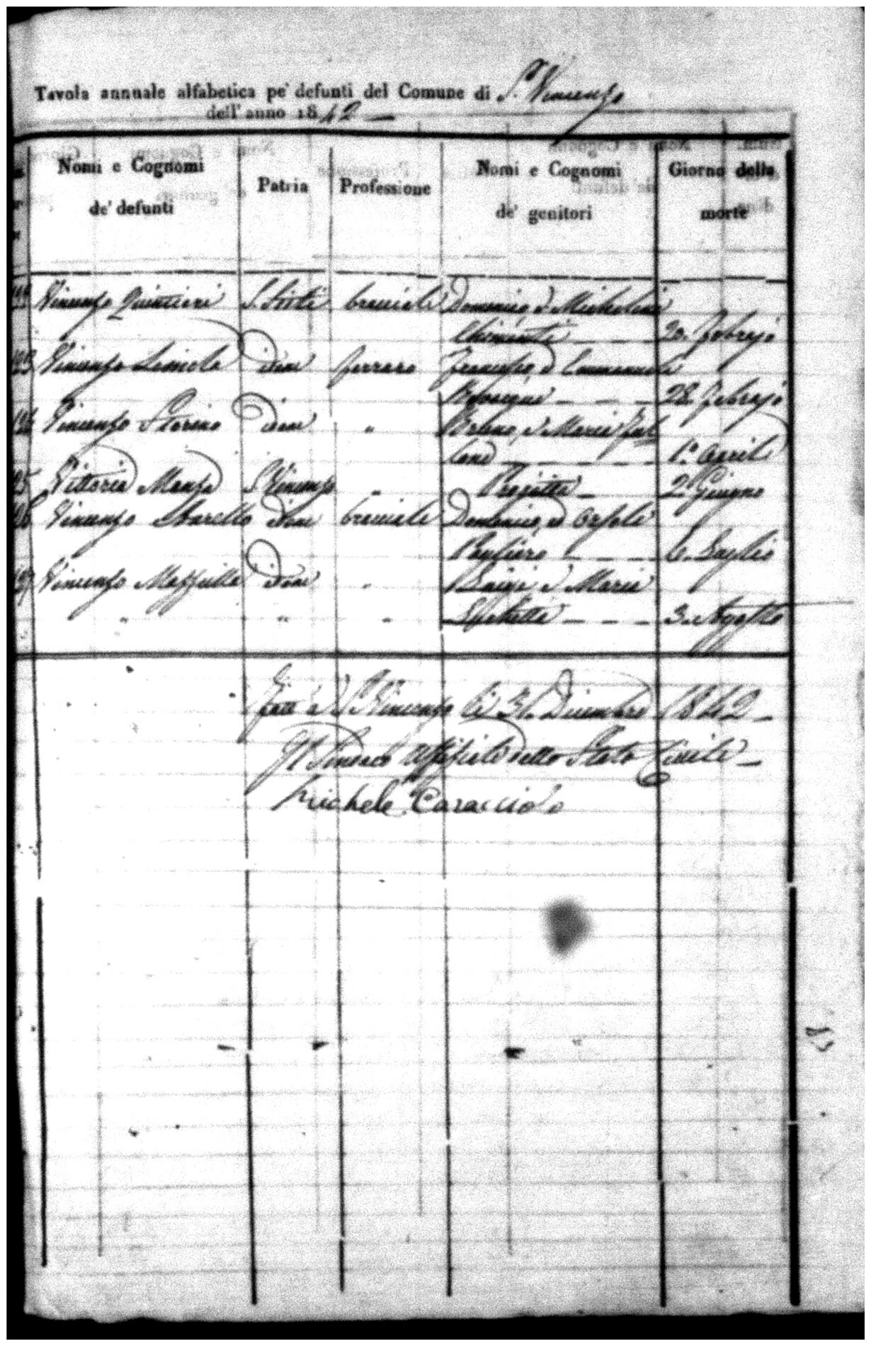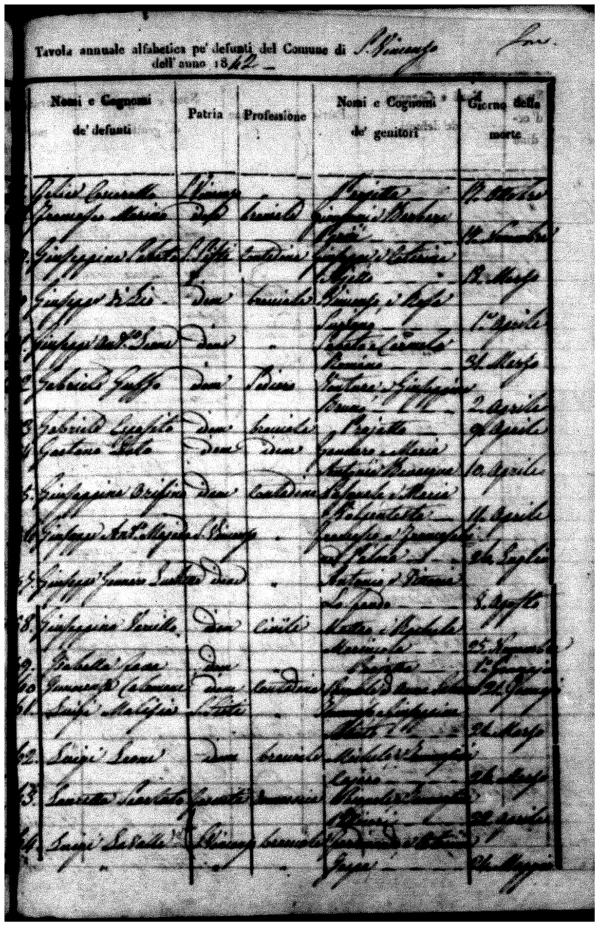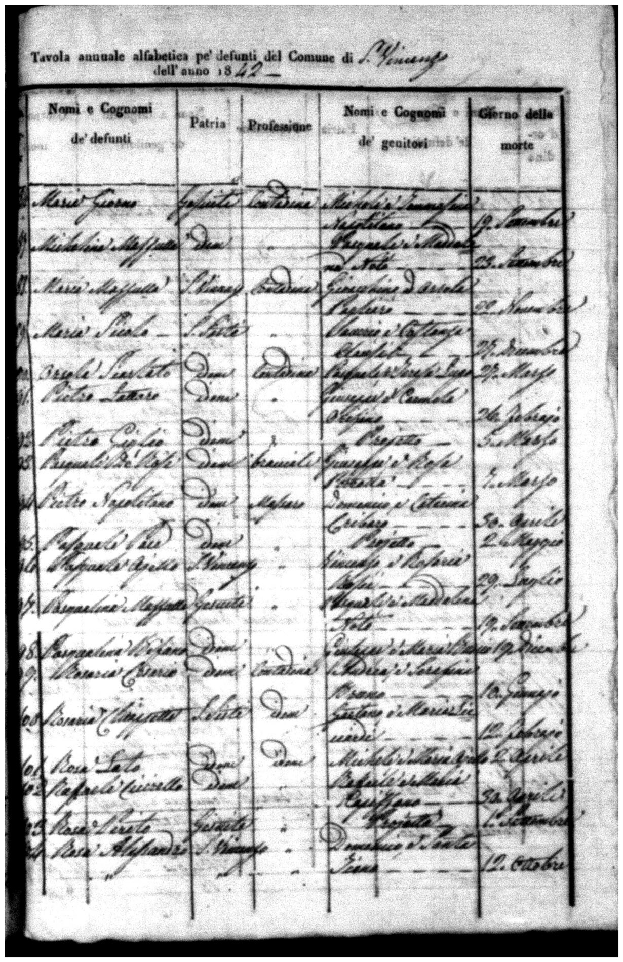Indexes for Death acts filed in the State Civil Office of San Vincenzo La Costa. Most of the Indexes contain the names of the deceased, where they lived, their mother's name, their father's name and the date.
