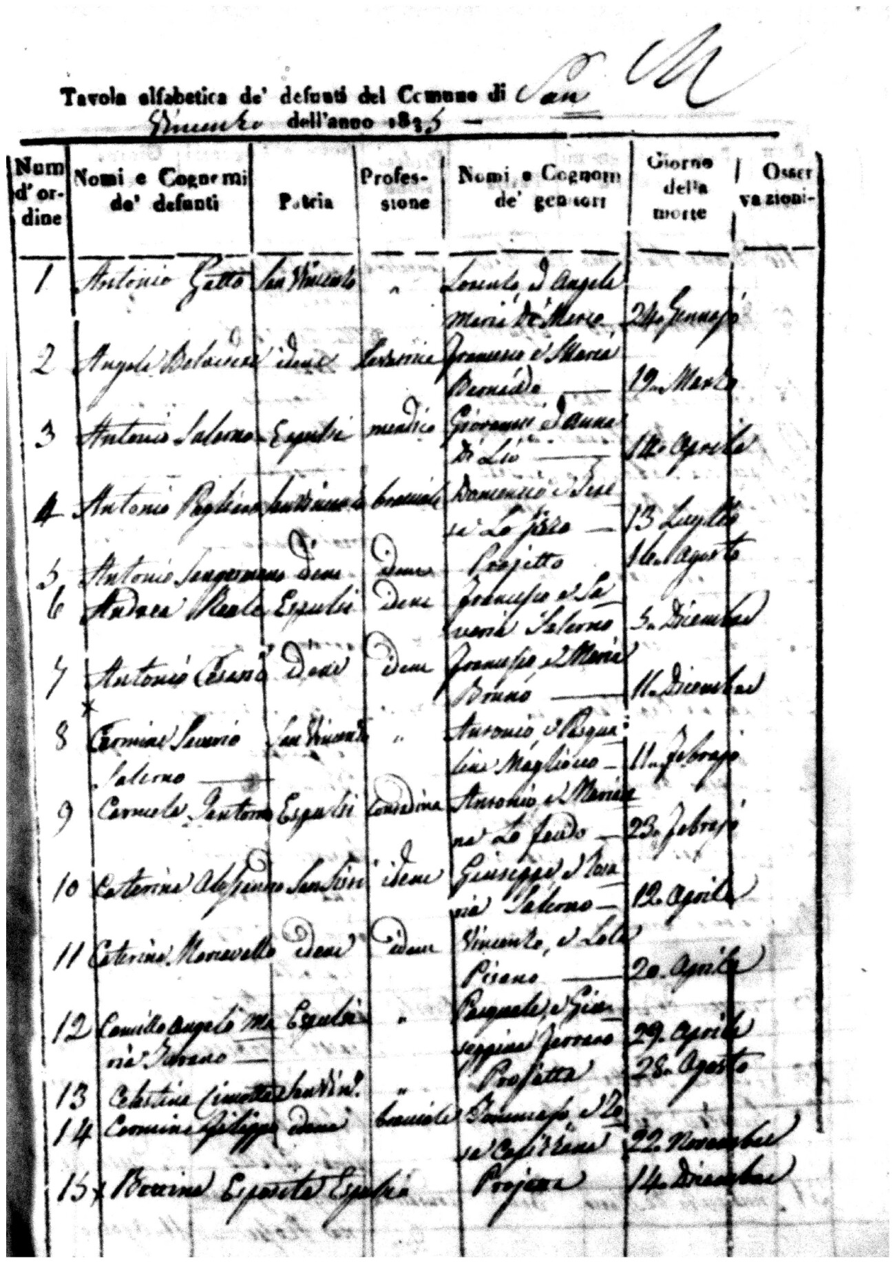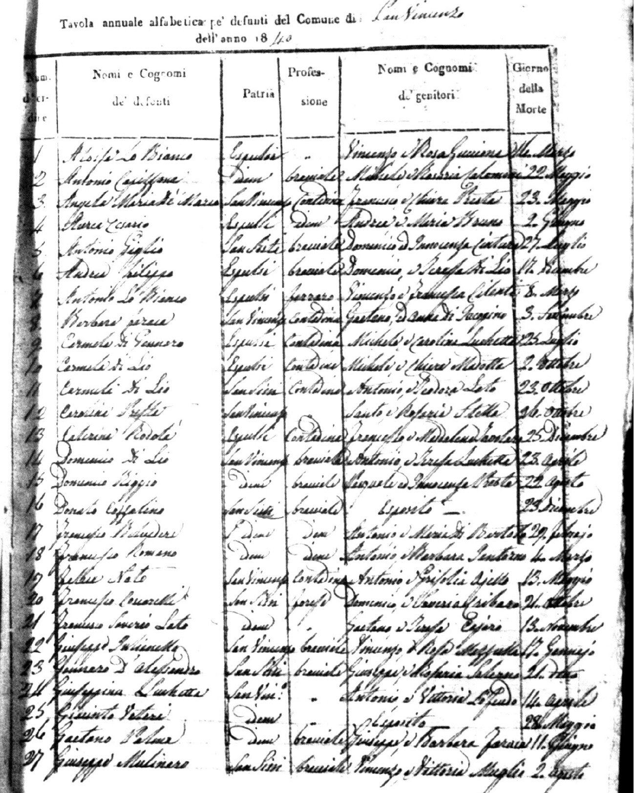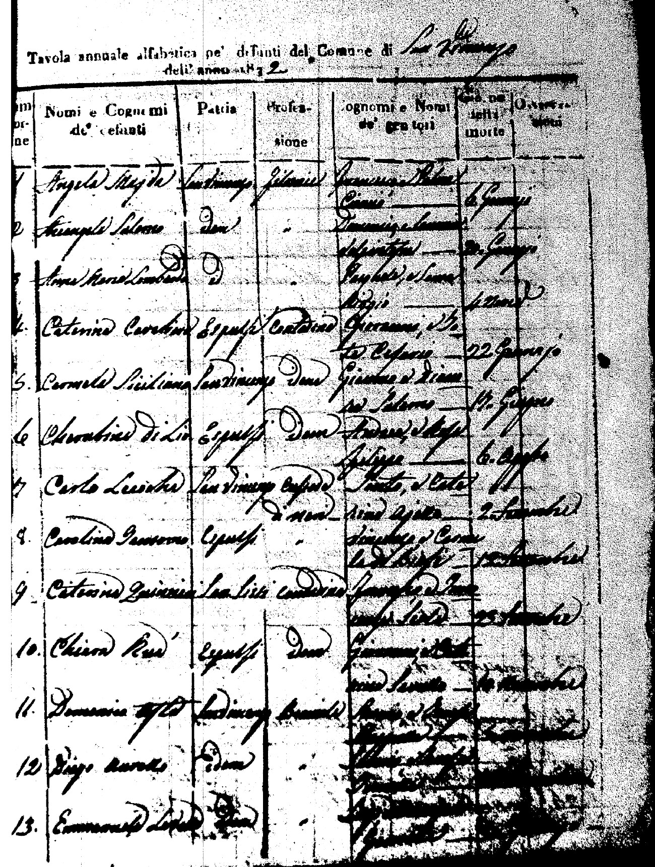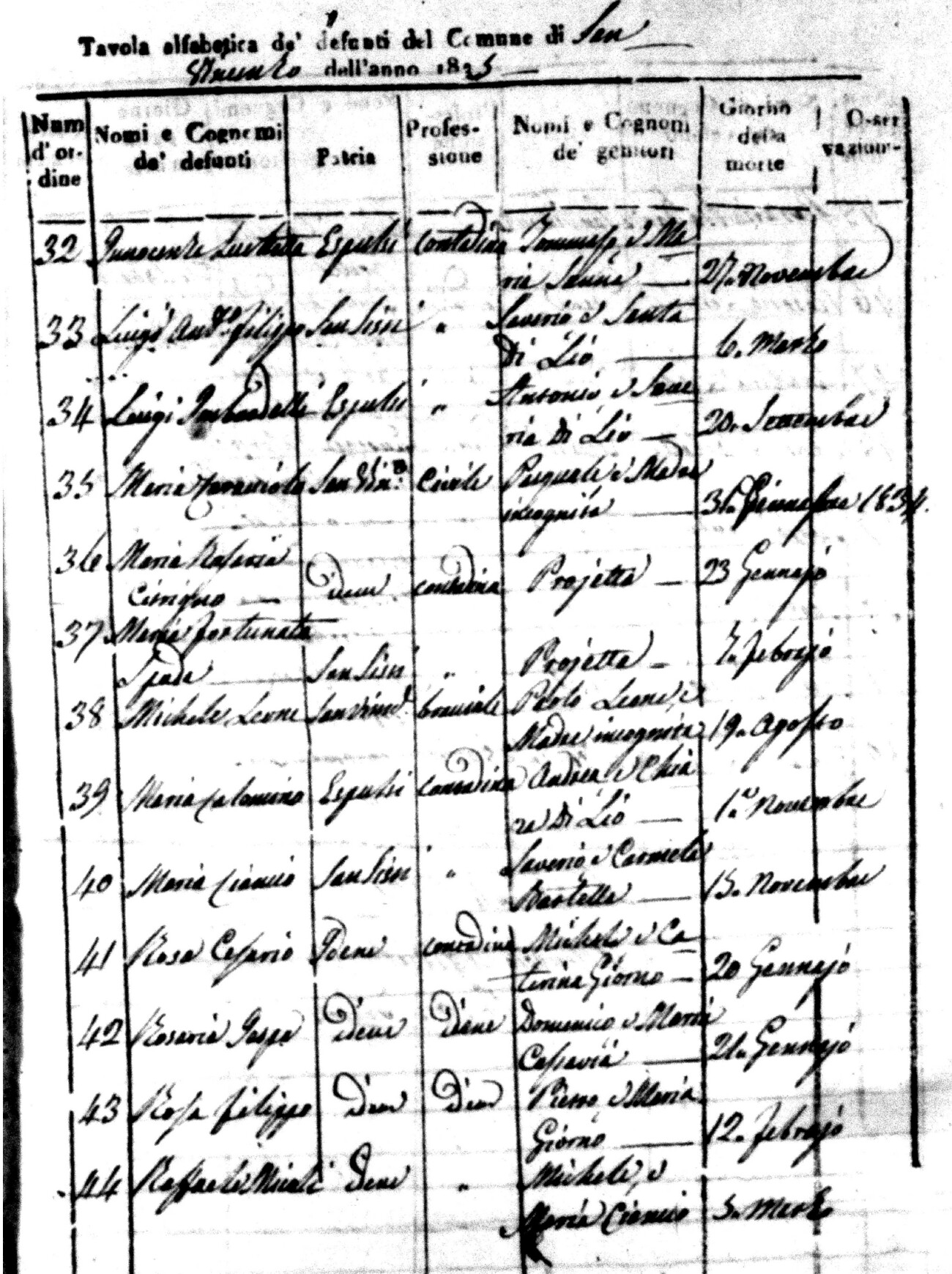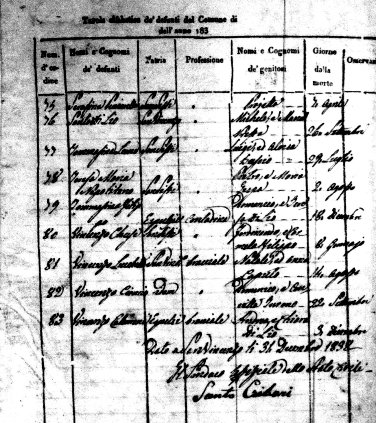 Indexes for Death acts filed in the State Civil Office of San Vincenzo La Costa. Most of the Indexes contain the names of the deceased, where they lived, their mother's name, their father's name and the date.