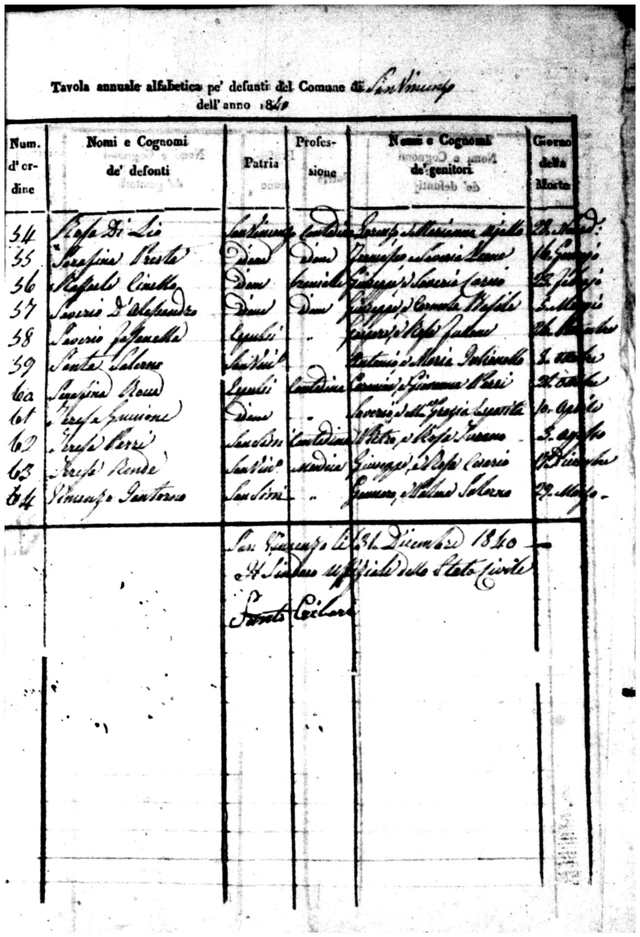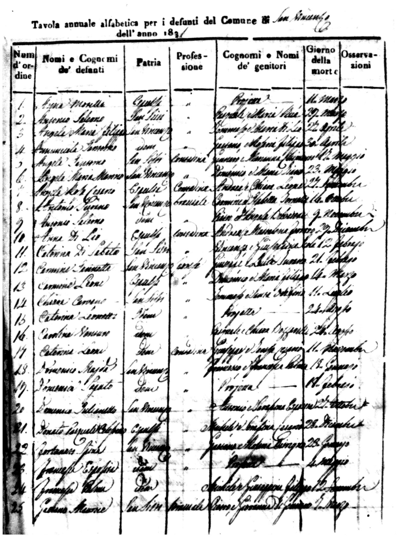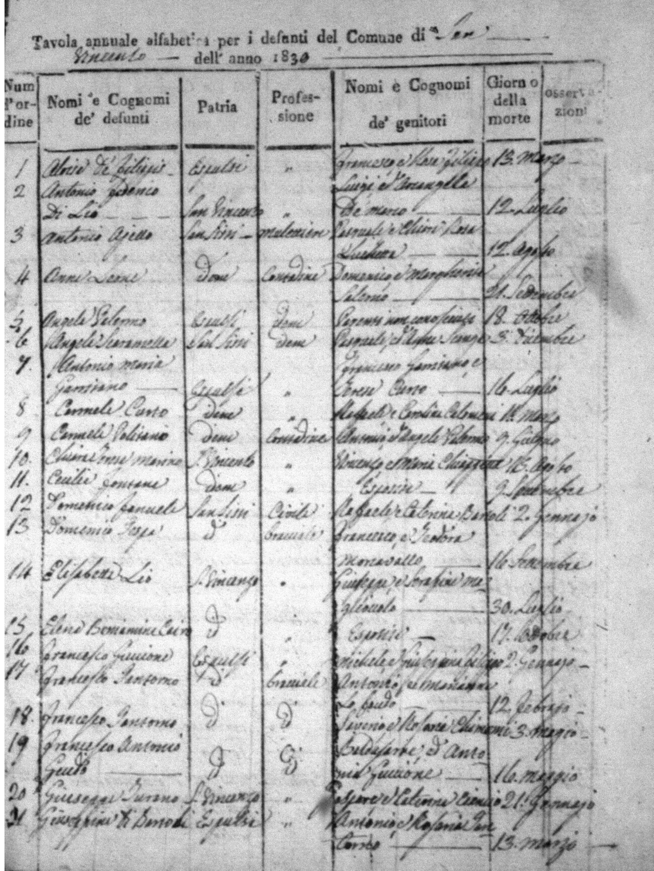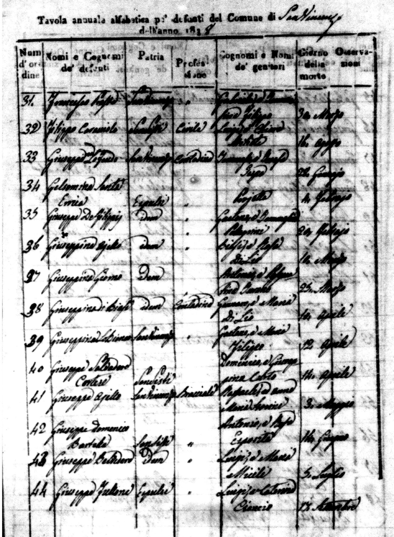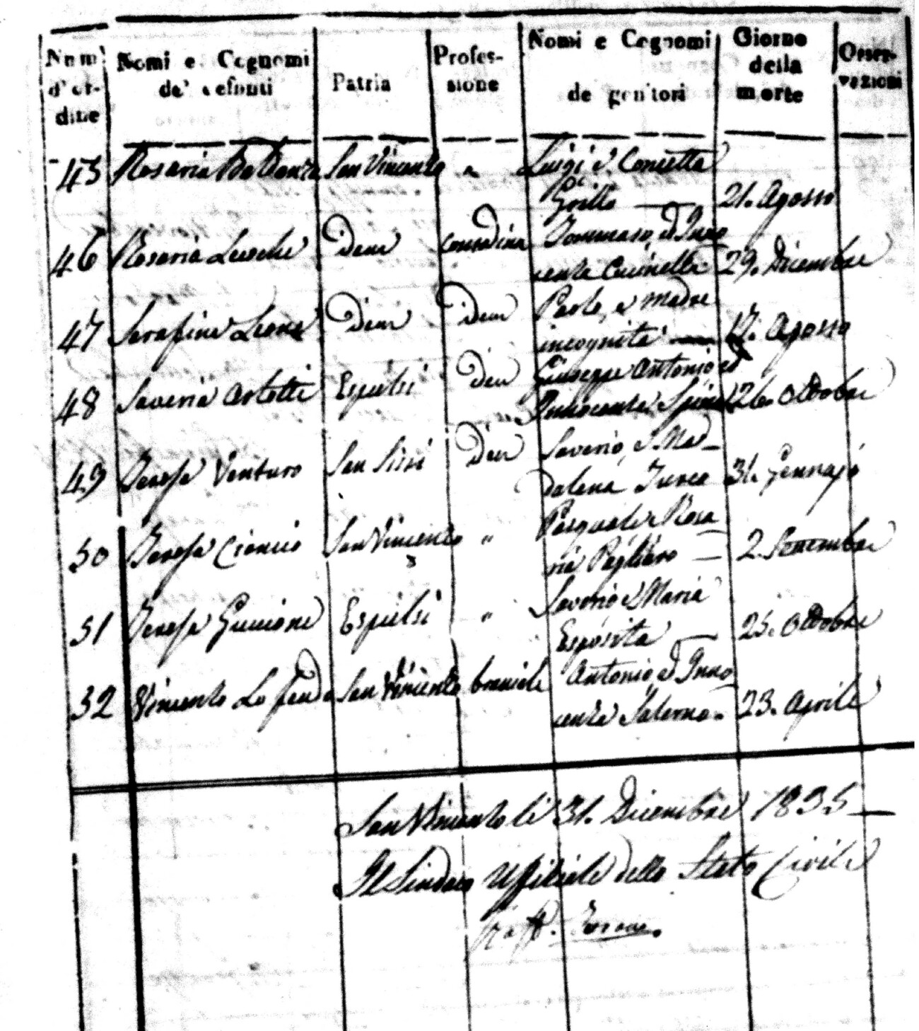 Indexes for Death acts filed in the State Civil Office of San Vincenzo La Costa. Most of the Indexes contain the names of the deceased, where they lived, their mother's name, their father's name and the date.