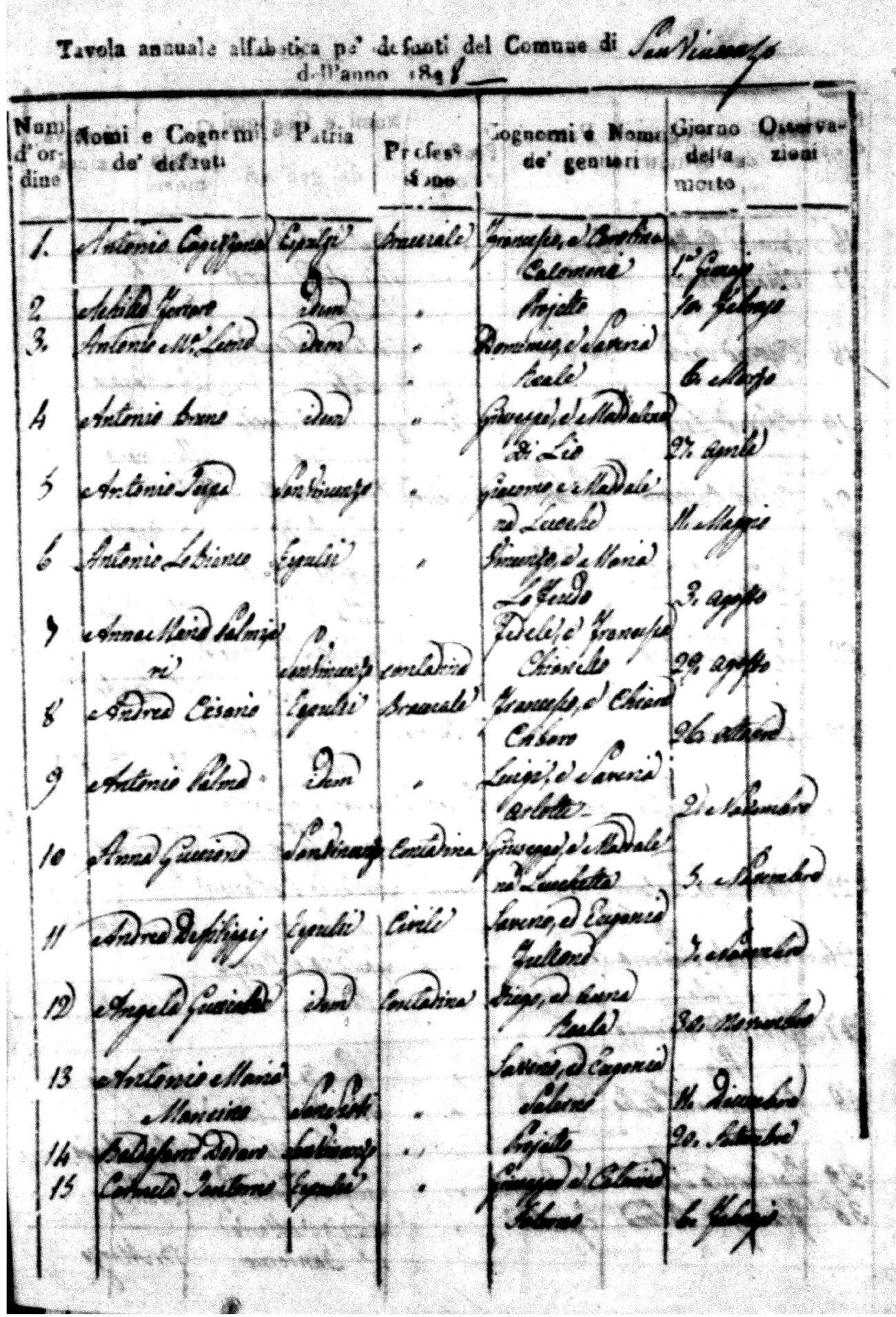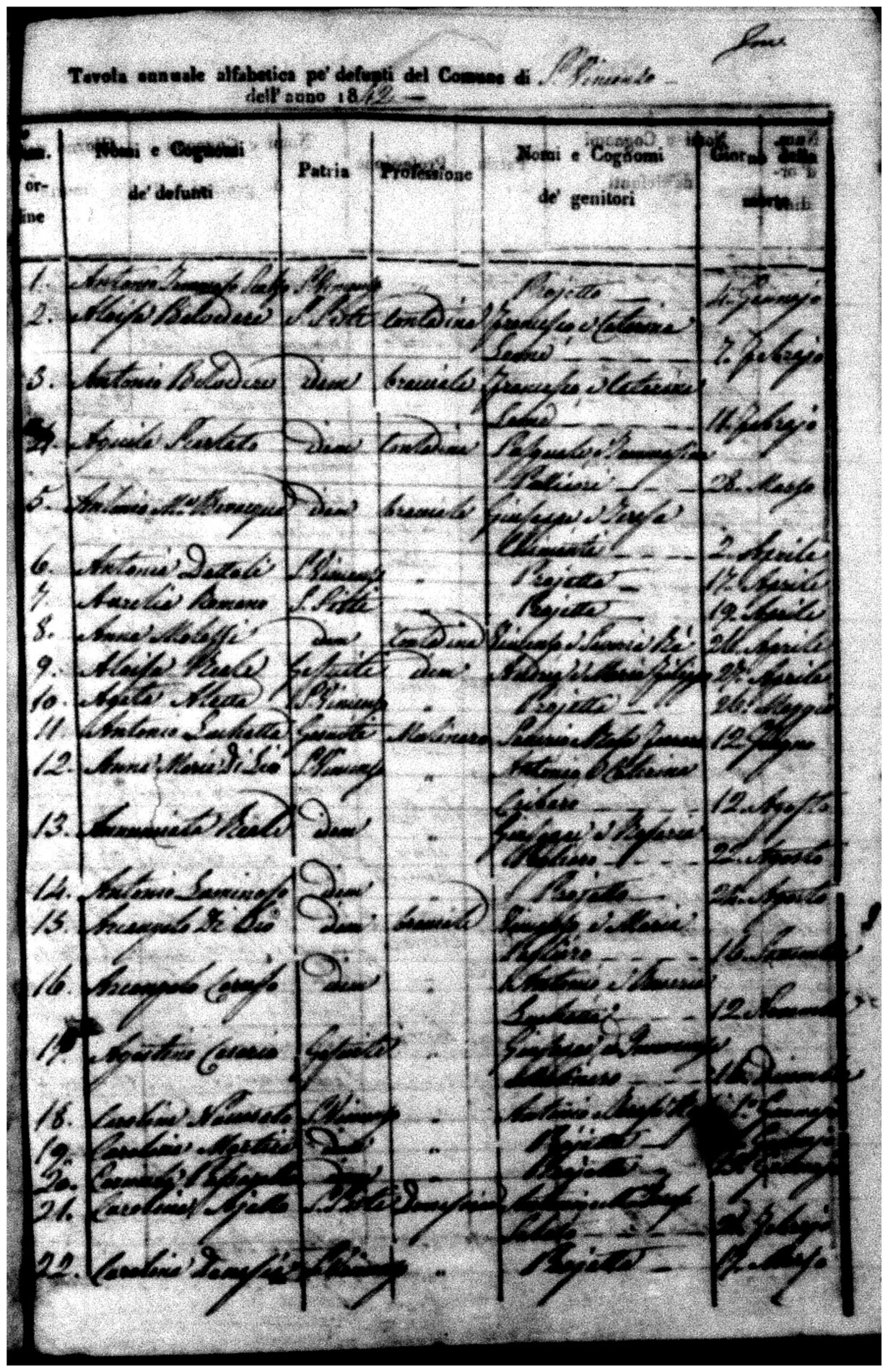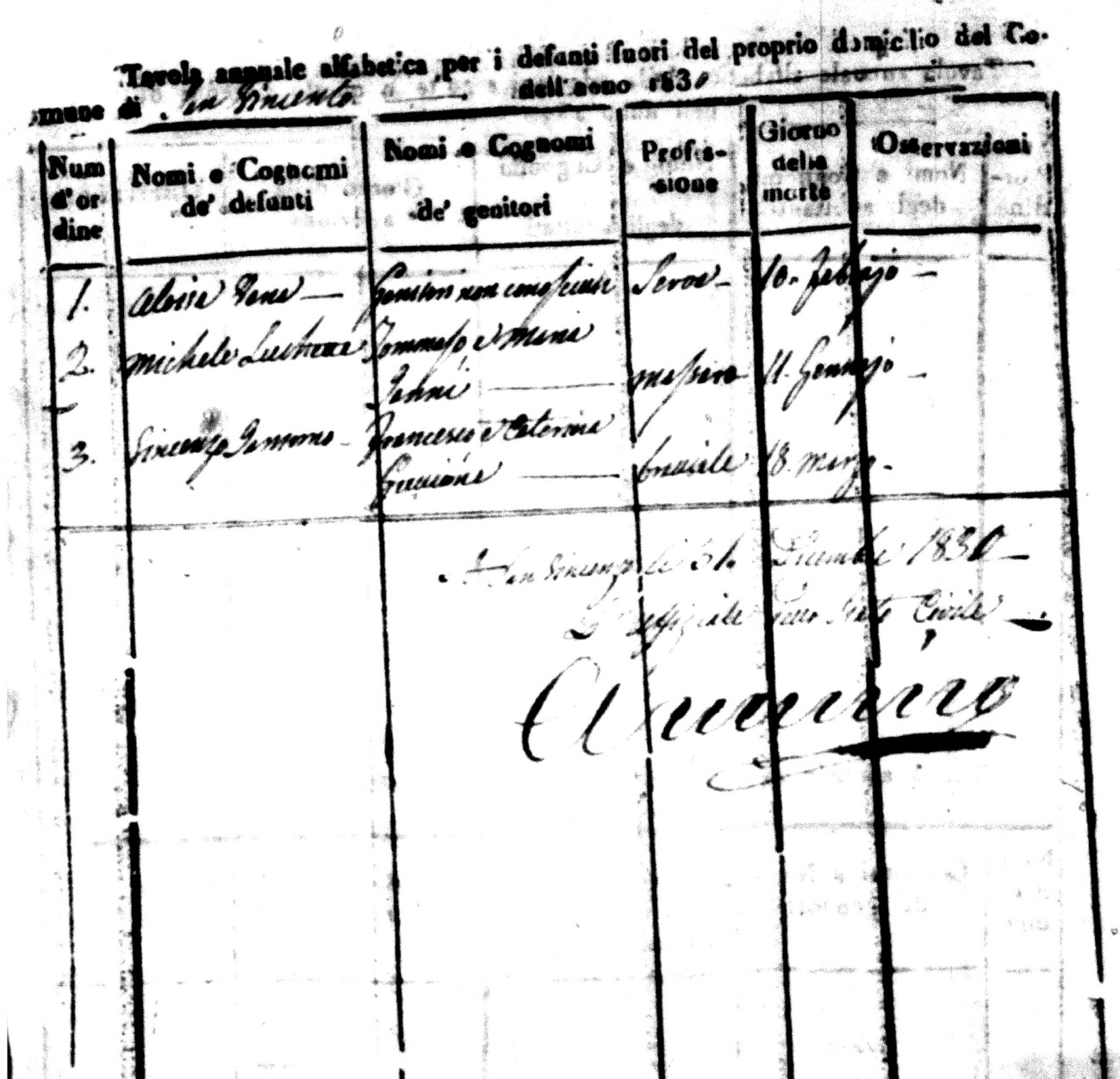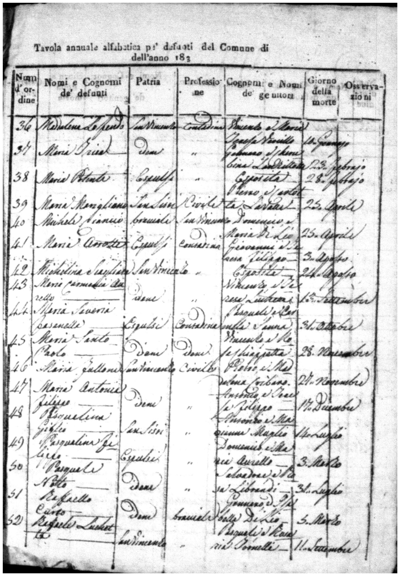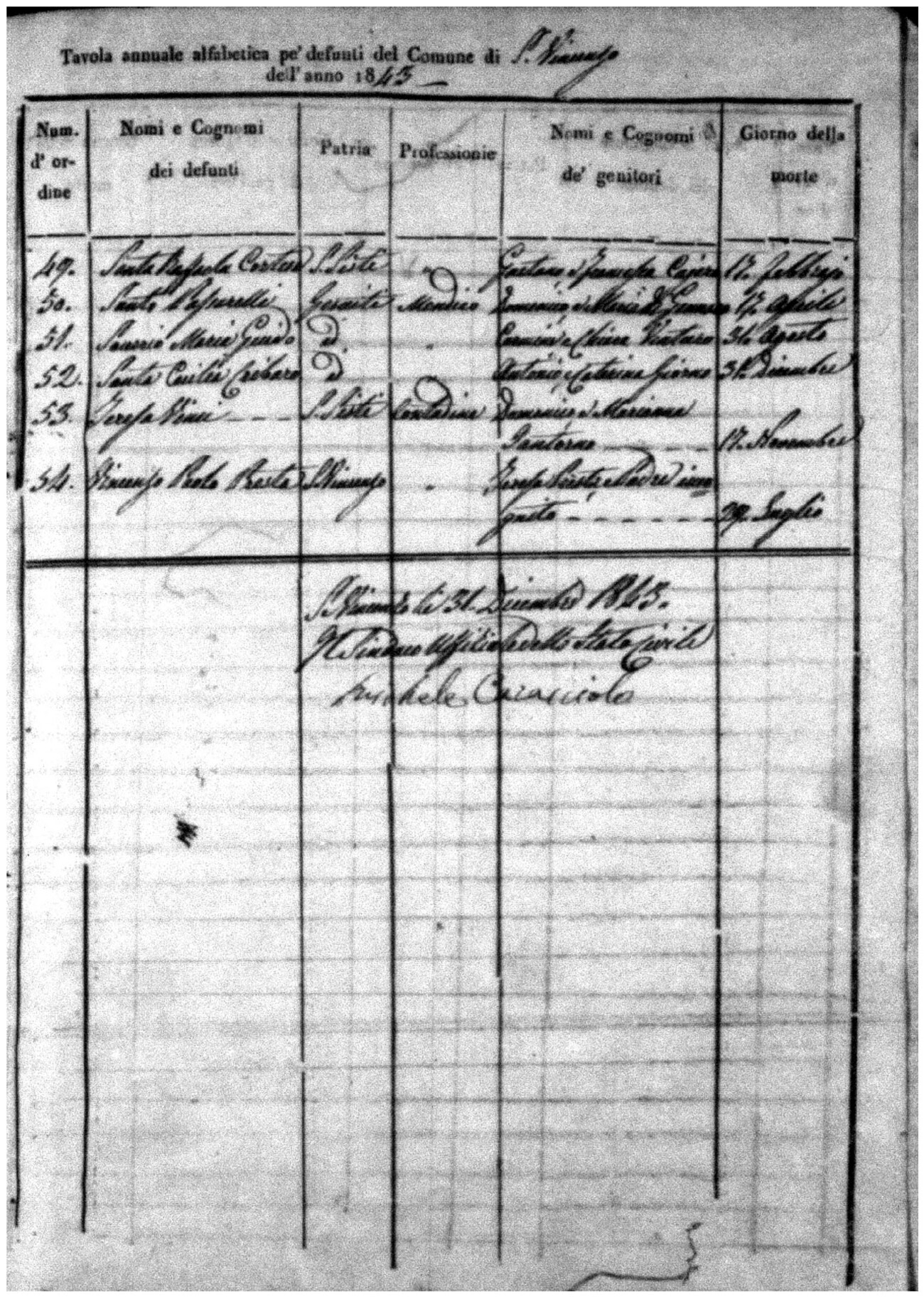 Indexes for Death acts filed in the State Civil Office of San Vincenzo La Costa. Most of the Indexes contain the names of the deceased, where they lived, their mother's name, their father's name and the date.