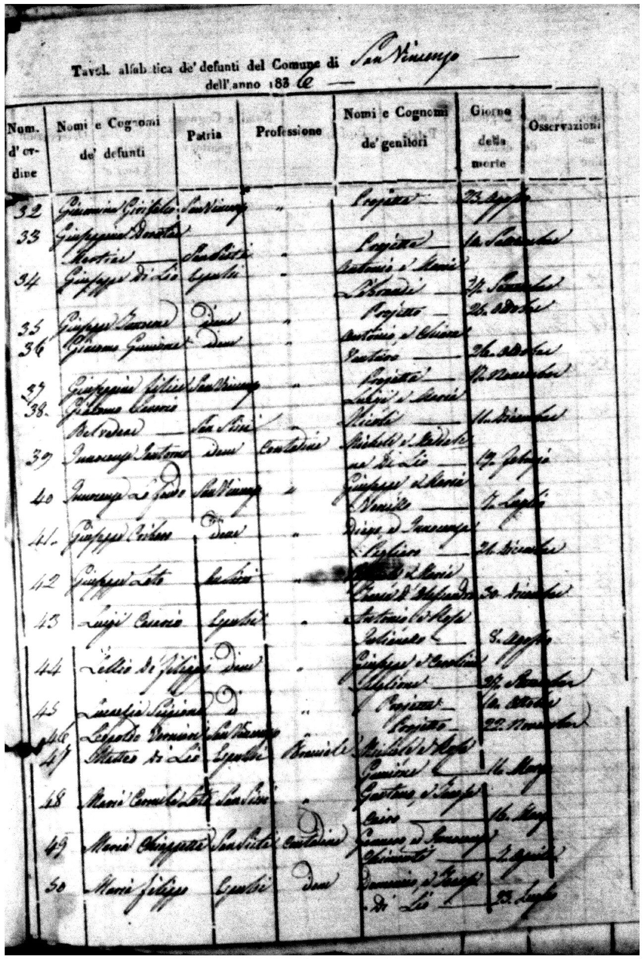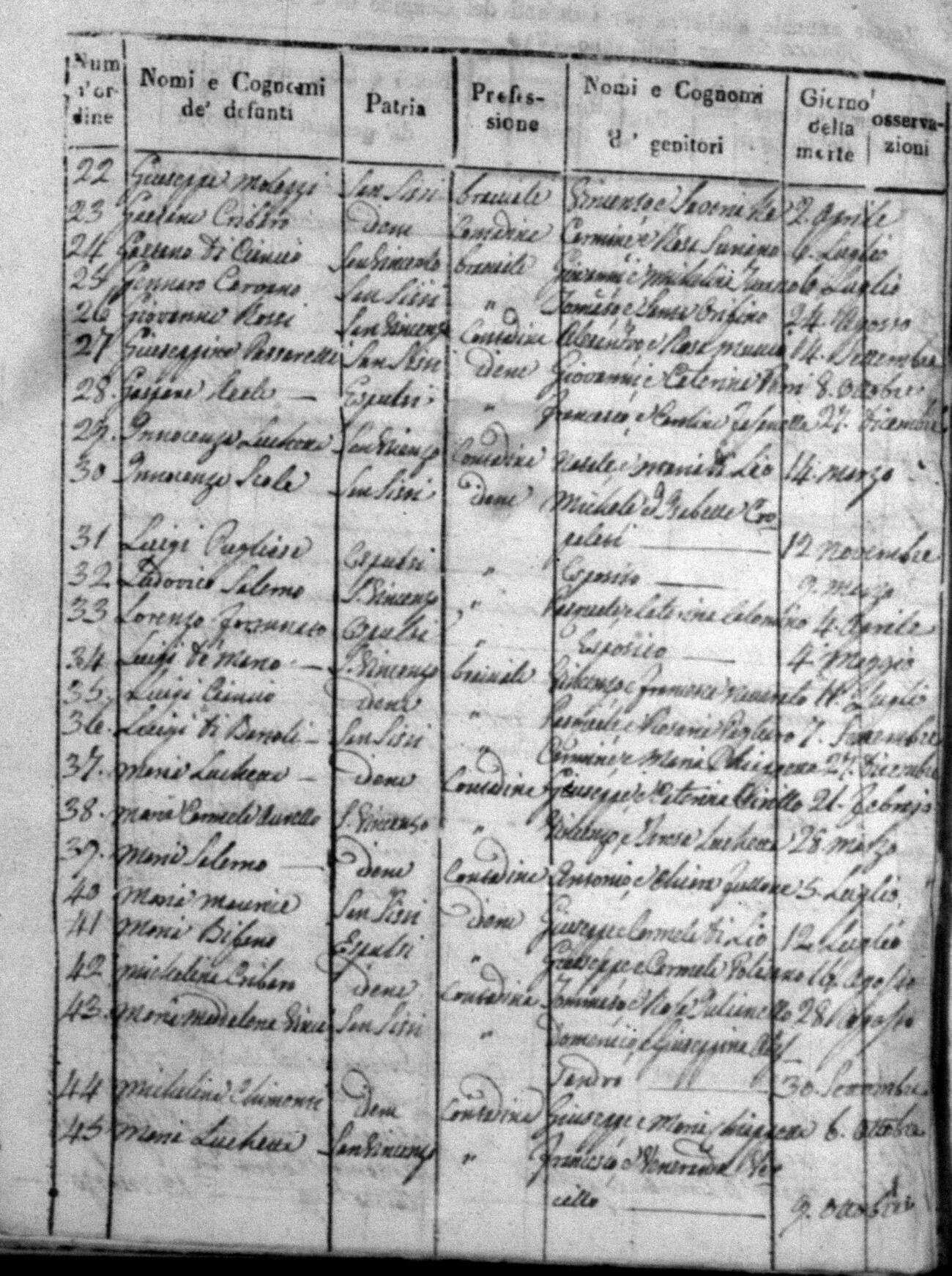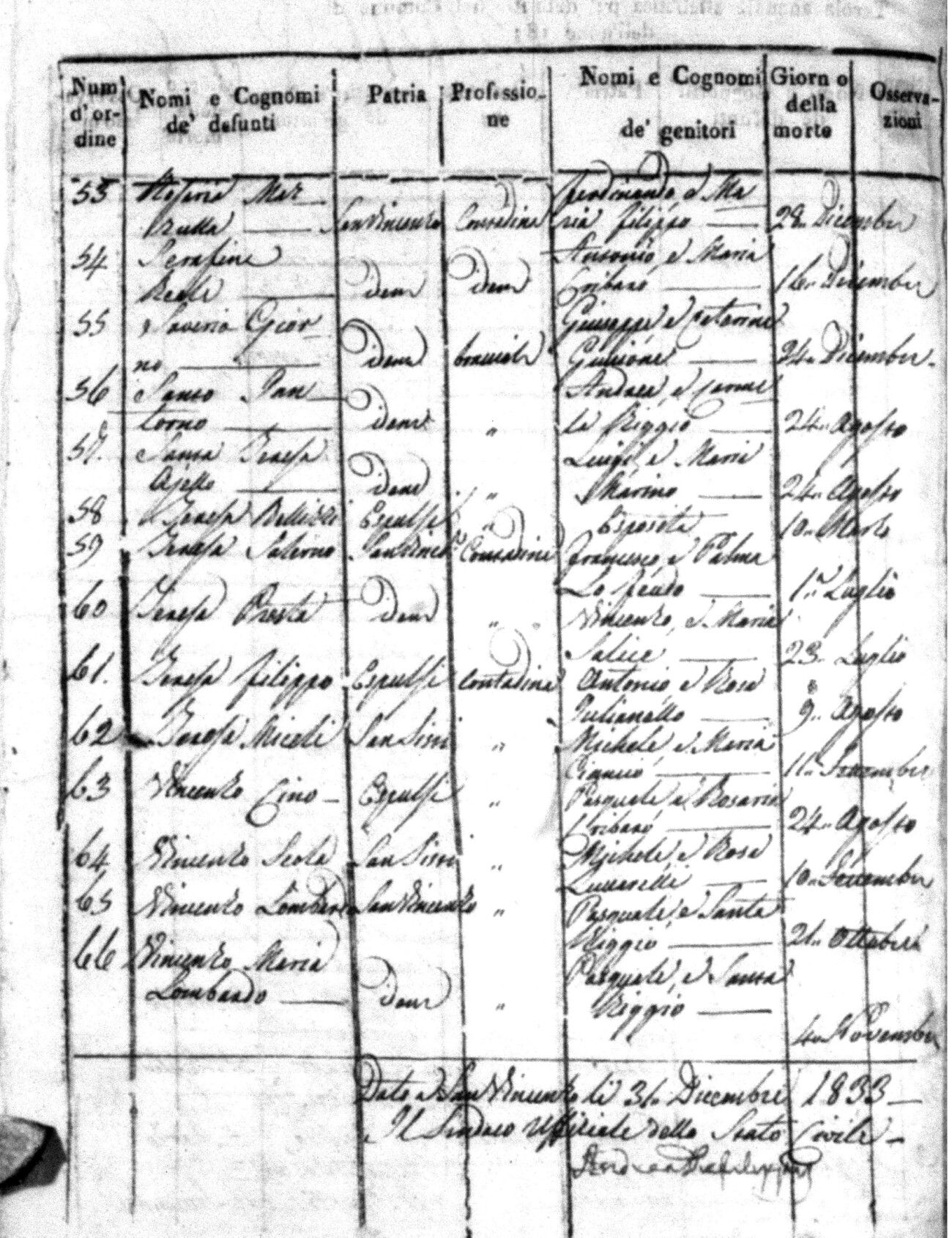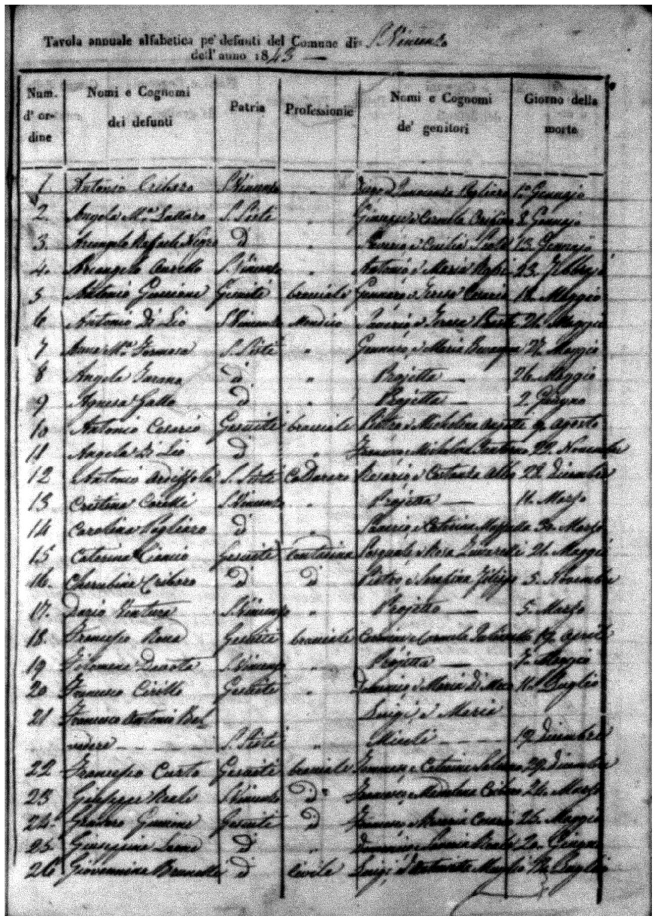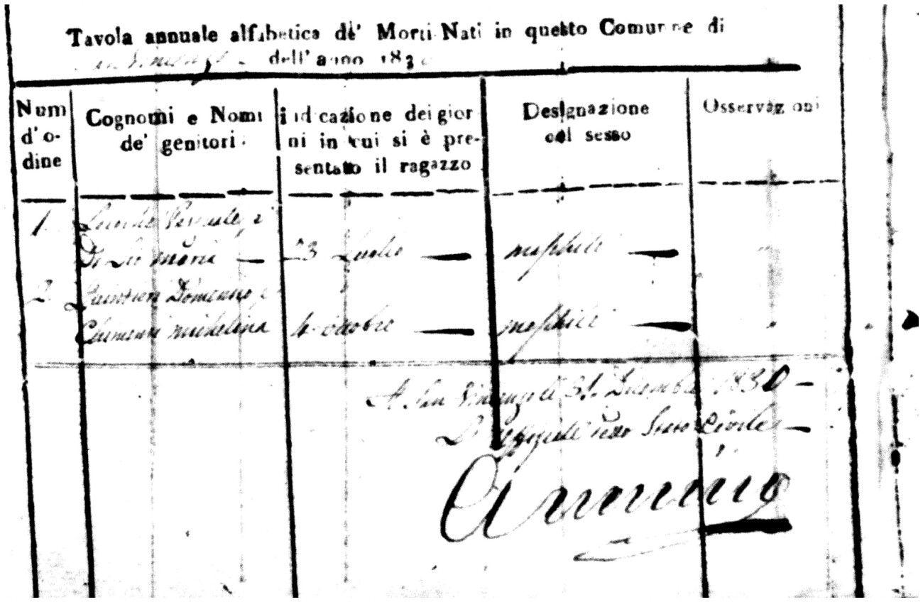 Indexes for Death acts filed in the State Civil Office of San Vincenzo La Costa. Most of the Indexes contain the names of the deceased, where they lived, their mother's name, their father's name and the date.