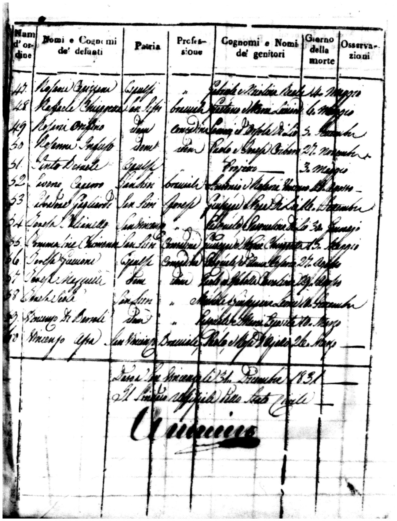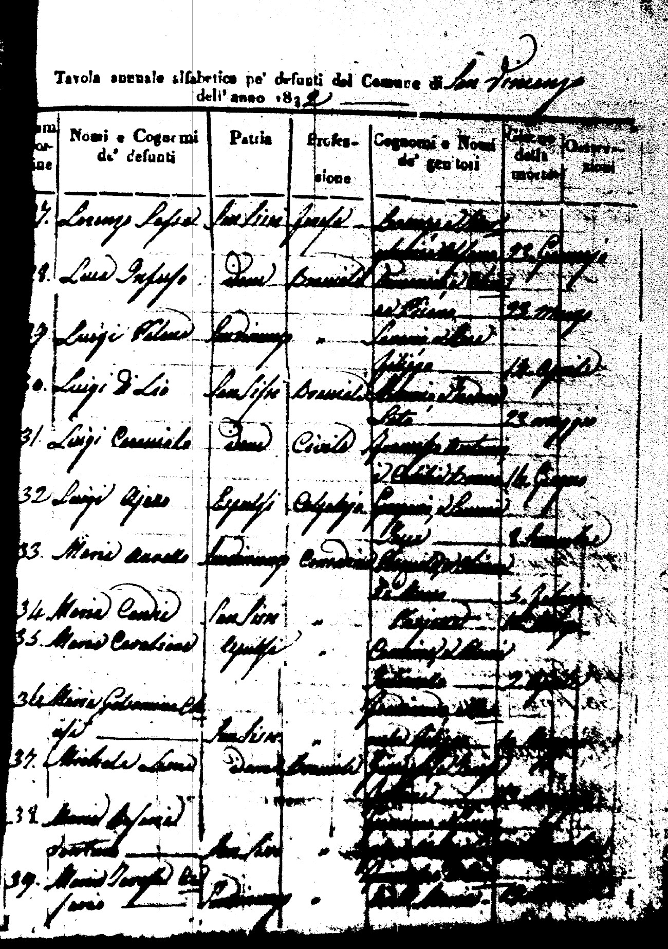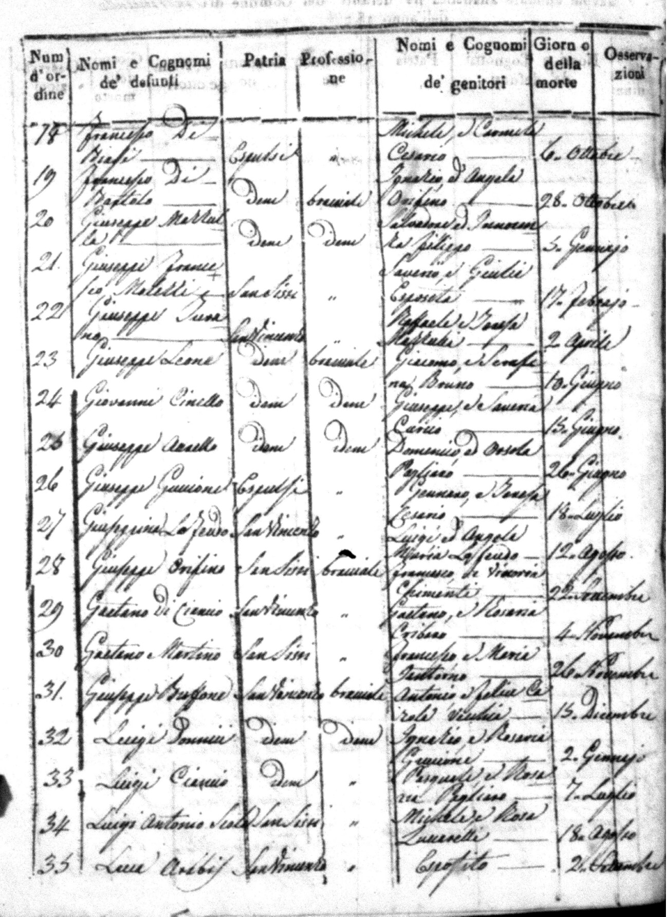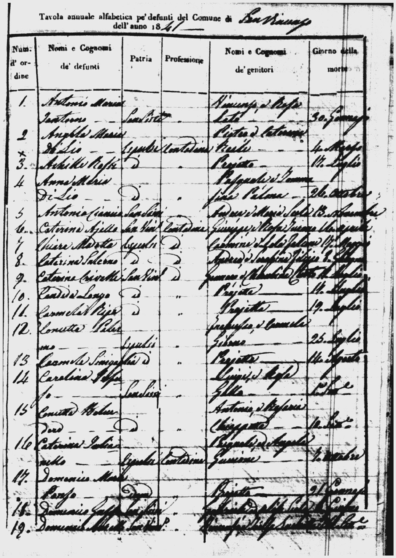 Indexes for Death acts filed in the State Civil Office of San Vincenzo La Costa. Most of the Indexes contain the names of the deceased, where they lived, their mother's name, their father's name and the date.